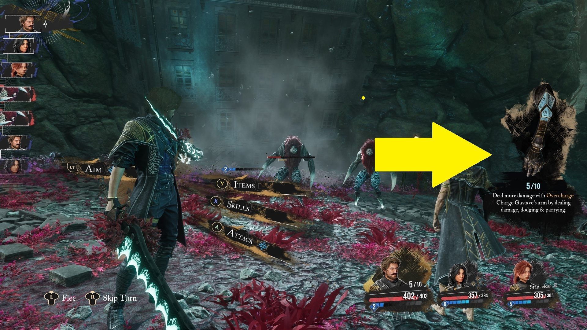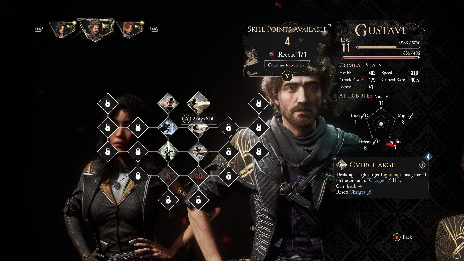Jeżeli zdecydujecie się oprzeć build Gustave'a na umiejętności Przeciążenie, priorytetyzujcie umiejętności uderzające więcej niż 1 raz na turę. Dobrym przykładem będą tutaj podstawowy Atak Lumiere oraz Nawał Ciosów. Oba ruchy generują dodatkowe ładunki podczas trafień krytycznych, zatem warto rozwinąć atrybut szczęścia u Gustave'a. Szansę na trafienie krytyczne możecie dodatkowo zwiększyć zakładając odpowiednie Pikto np: Krytyczne płonięcie.