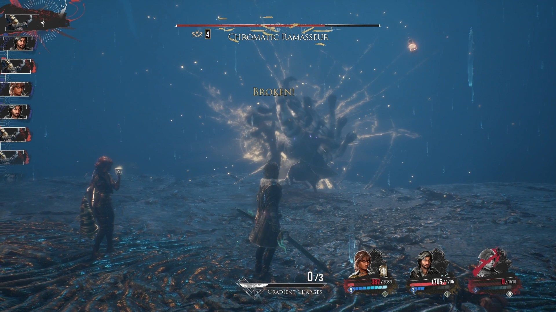 W walce z Chromatycznym Ramasseurem nie będziecie mieli okazji atakować. Tura bossa nigdy się nie kończy, dopóki nie napełnicie jego paska przełamania, co możecie zrobić wyłącznie kontratakami. Wyekwipujcie się zatem w pikto wzmacniające parowanie i kontrataki. Boss jest odporny na mrok, zatem nie wyposażajcie się w broń o tym żywiole. Posiadając pikto lub luminę pierwsze uderzenie możecie zagwarantować sobie pierwszą turę - najlepiej będzie użyć ją by wzmocnić drużynę, np. nakładając na wszystkich potęgę by wzmocnić kontrataki lub skorupę by zmniejszyć otrzymywane obrażenia.