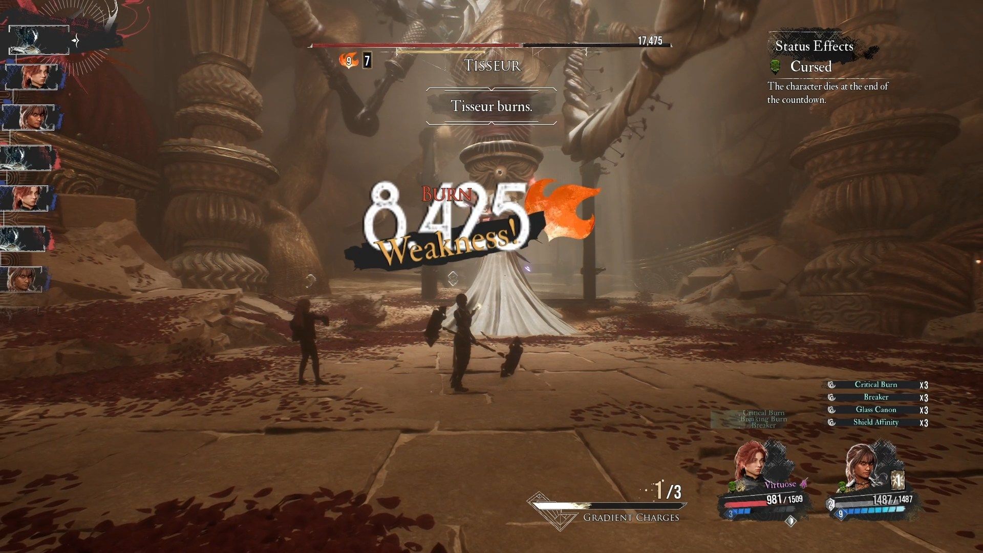 Tisseur jest podatny na ogień i światło, a odporny na lód i mrok. Ta walka w całości opiera się na limicie tur, jaki nakłada na was boss przez swoją klątwę. Chcecie zatem pozbyć się go jak najszybciej. Maelle i Lune są tu szczególnie przydatne dzięki ich umiejętnościom podpalającym, dzięki którym boss odnosić będzie bardzo pokaźne obrażenia co turę.
