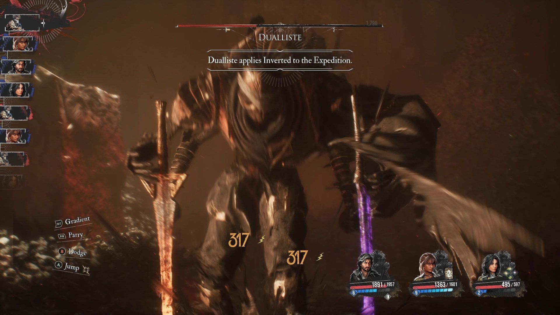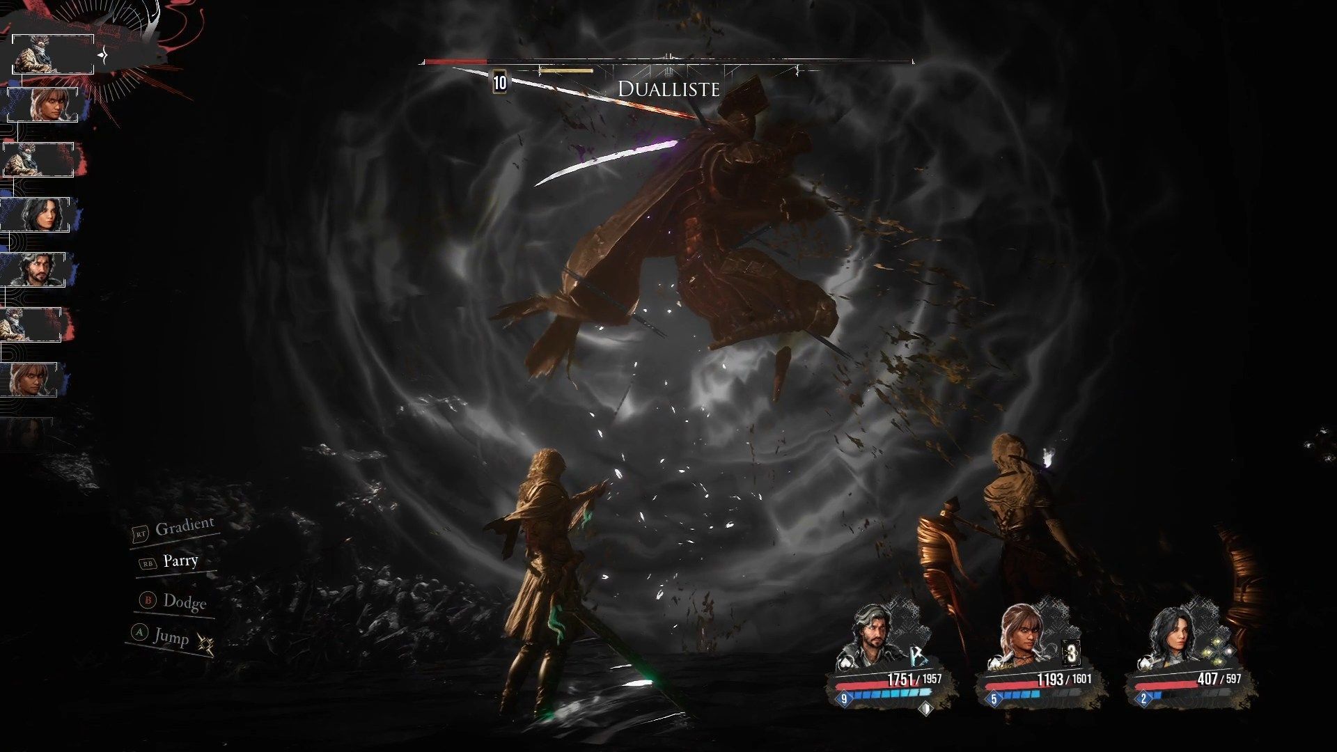 - Combo - Dualista podchodzi do członka drużyny i wykonuje kombinację dziewięciu ciosów. Nasłuchujcie bossa i parujcie gdy usłyszycie dźwięk przecinanego mieczem powietrza. Ostatni atak jest atakiem gradientu - bądźcie gotowi na kontrę gradientu gdy boss wyskoczy w powietrze.