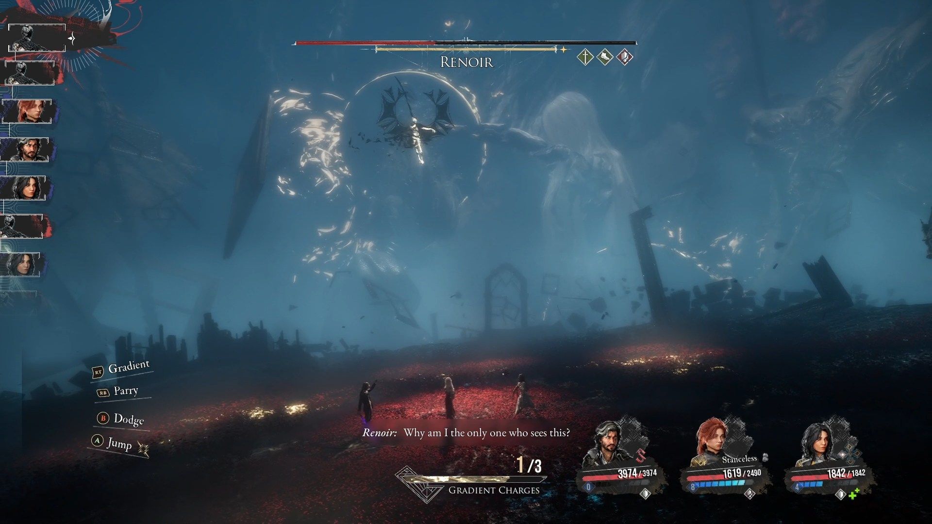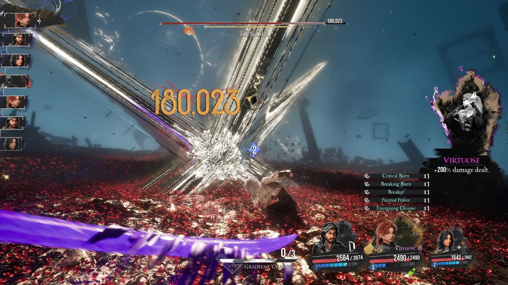 Renoir na początku fazy wejdzie do płótna rodziny Dessendre, co da mu permanentną Potęgę, Skorupę oraz Przyspieszenie. Możecie pozbyć się tych wzmocnień nakładając na niego odpowiadające im debuffy. Macie na to wiele sposobów w zależności od swojego builda i wyposażonych umiejętności, lecz najbardziej wydajnym jest drugi atak gradientowy Sciel - nałoży on na Renoira wszystkie debuffy naraz.