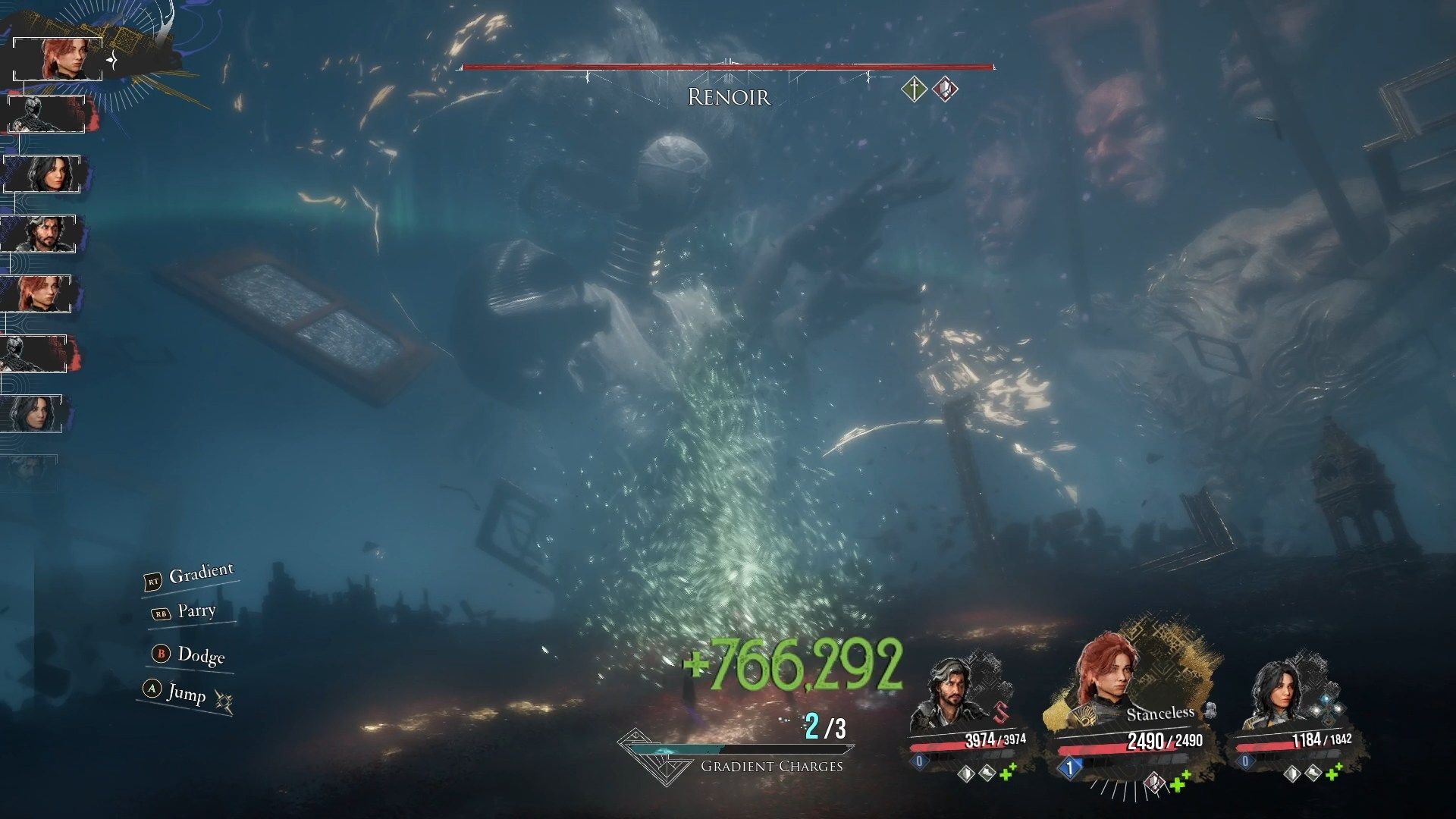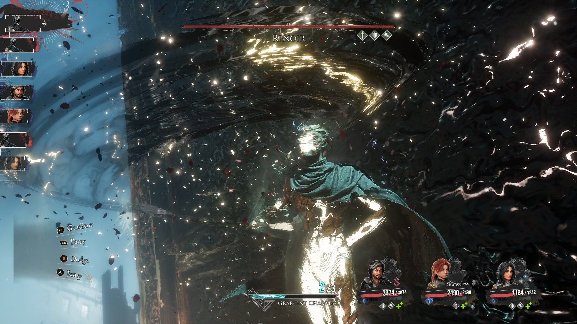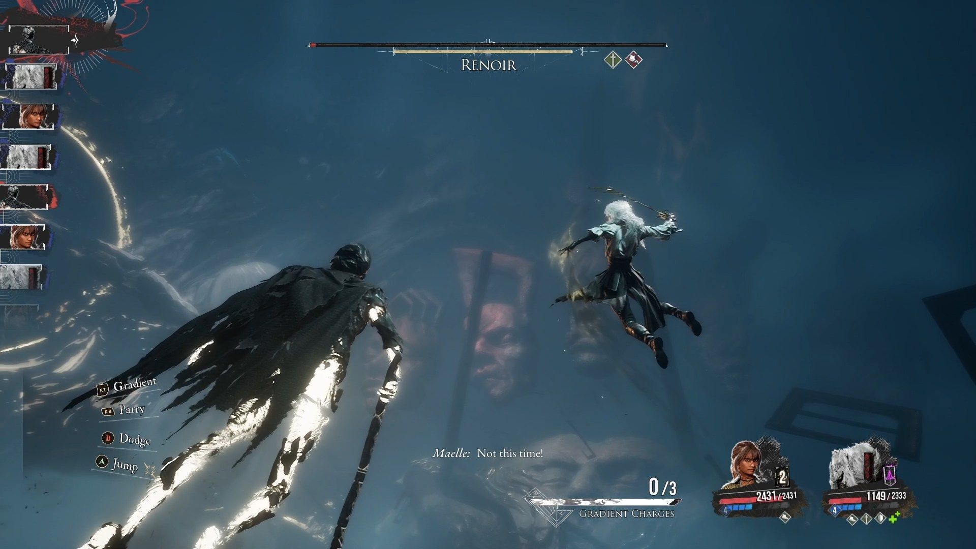 Renoir jest neutralny na wszystkie żywioły. Jak przystało na ostatnią walkę, nie ma tu żadnych unikatowych mechanik - jest to jedynie test wszystkich zdobytych przez was umiejętności, a zwłaszcza parowania. W pierwszej fazie strzeżcie się zwłaszcza czarnej dziury i krzyża otchłani - są to jego najbardziej niszczycielskie ataki. Renoir ma ogromną ilość zdrowia, więc Maelle ze swoimi nowo zdobytymi umiejętnościami Malarki jest tu niezbędna - wyposażenie ją w luminę Malowana moc, zdobytą za pokonanie Malarki, i korzystanie z umiejętności Stendahl w postawie wirtuozerskiej skutkować będzie olbrzymimi obrażeniami.