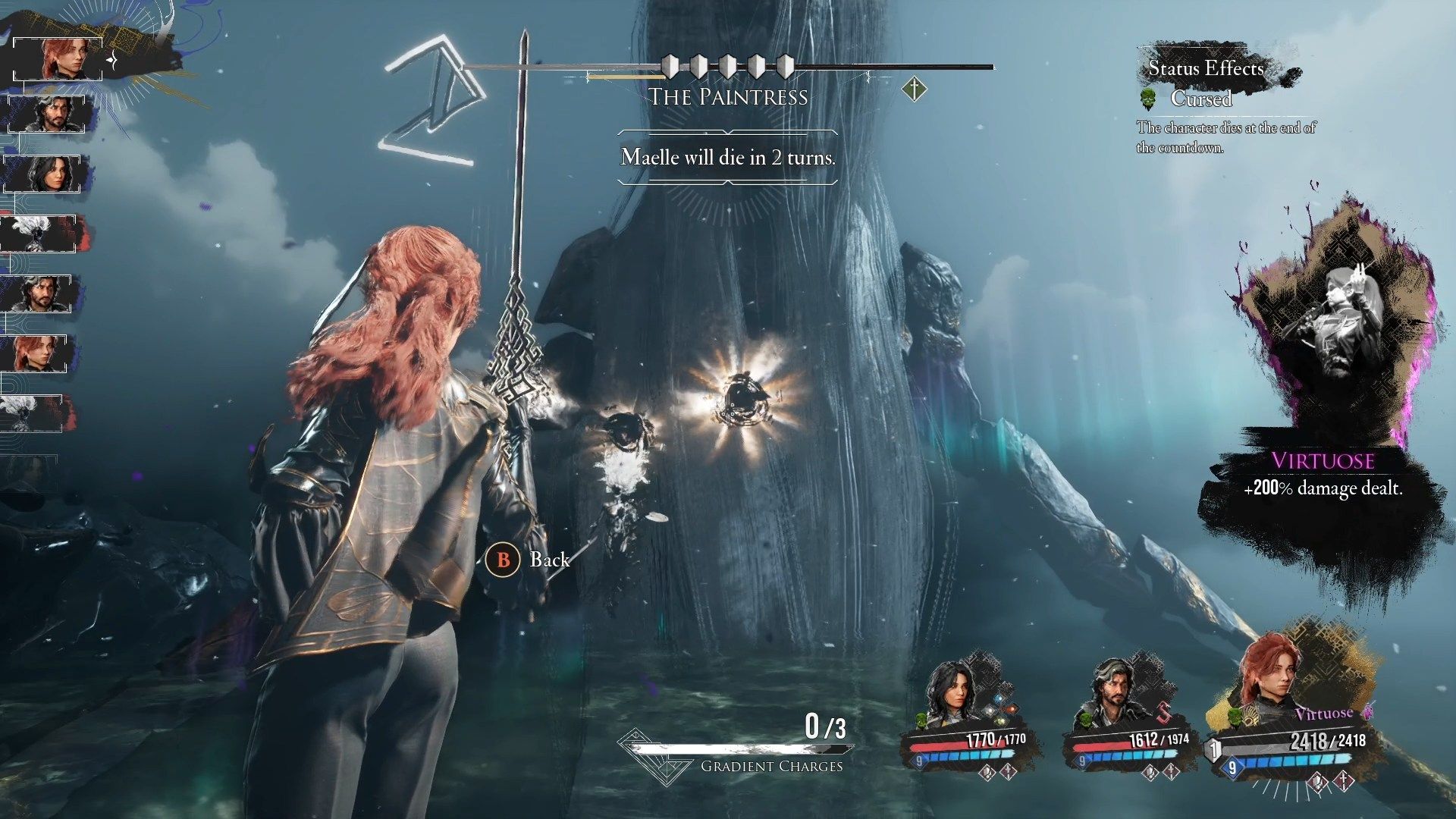 - Świetlisty pędzel - Malarka zadaje trzy ciosy obszarowe świetlistym pędzlem. Dwa pierwsze ciosy to zwykłe zamachy, na które możecie zareagować parowaniem, zaś trzeci zamach jest lekko opóźniony. Trafienie odbiera członkom drużyny 1 PA.