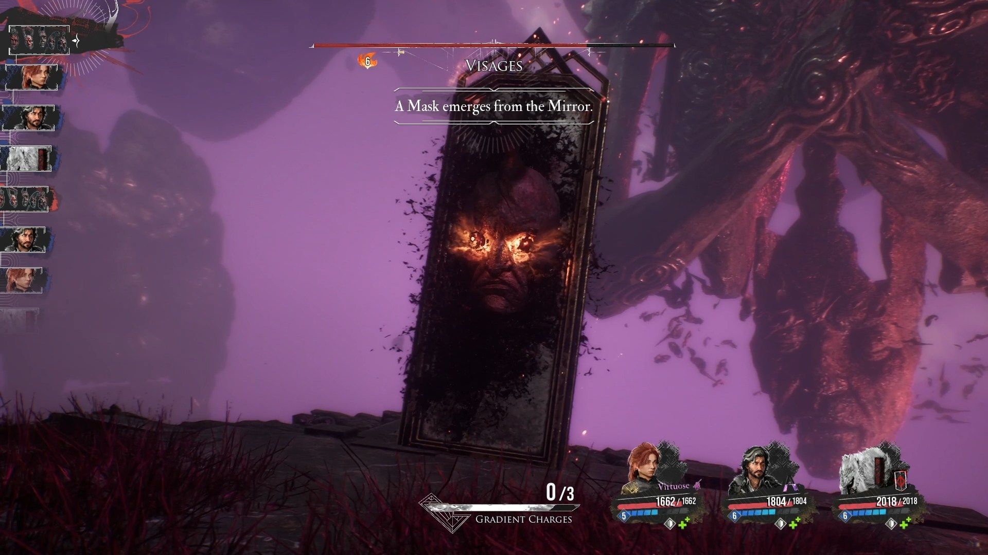 Pierwsza faza walki nie jest przesadnie trudna. Waszym celem nie jest stojący w tle olbrzym, a lustro na krańcu klifu. Ataki bossa łatwo sparować dzięki towarzyszącym im odgłosom dźwiękowym. Ponieważ aktywna maska cały czas się zmienia, co turę zmieniają się również słabości i odporności bossa. Jak zapewne zauważyliście, każda wydobywająca się z lustra maska ma świecące się oczy. Jeśli zniszczycie te oczy strzałem z broni dystansowej, maska nie będzie w stanie schować się w lustrze i zniszczy się na początku tury bossa - Visages nie będzie mógł już z niej skorzystać.