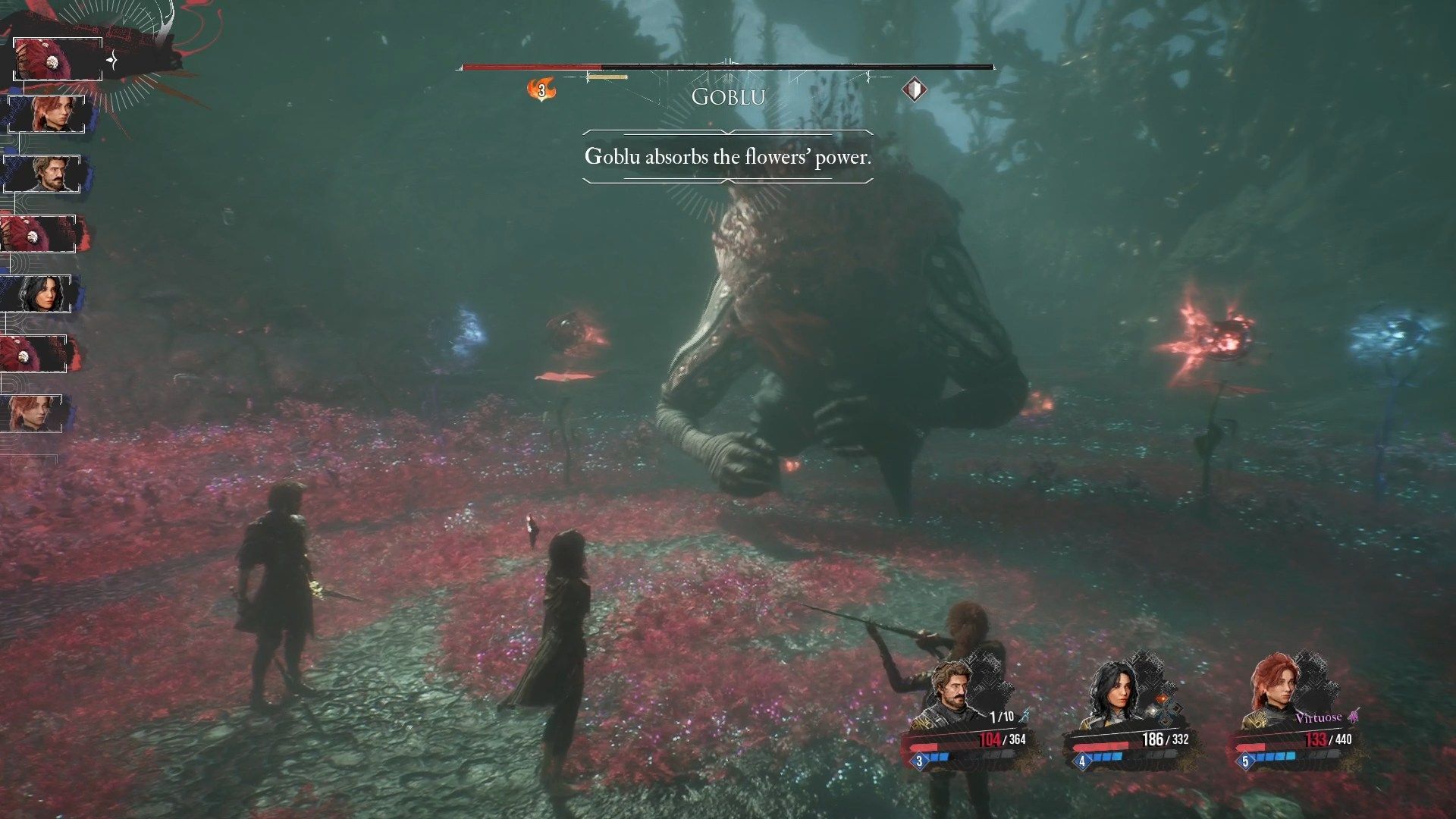 W porównaniu z napotykanym wcześniej opcjonalnym Bourgeonem, walka z Goblu jest bardzo prosta mechanicznie. Goblu całą walkę spędza sam, nie przyzywa żadnych sługusów i nie pozbawia was członków drużyny. Największym zagrożeniem będzie dla was atak skokiem - nie macie jeszcze możliwości leczenia całej drużyny, więc nie dajcie się mu nim trafić. Niszczcie kwiaty, żeby boss nie mógł pochłaniać ich mocy. Okazjonalnie boss będzie nakładał na siebie pancerz - niszczcie go korzystając z umiejętności uderzających wiele razy lub przy pomocy Breaking Rules Maelle.