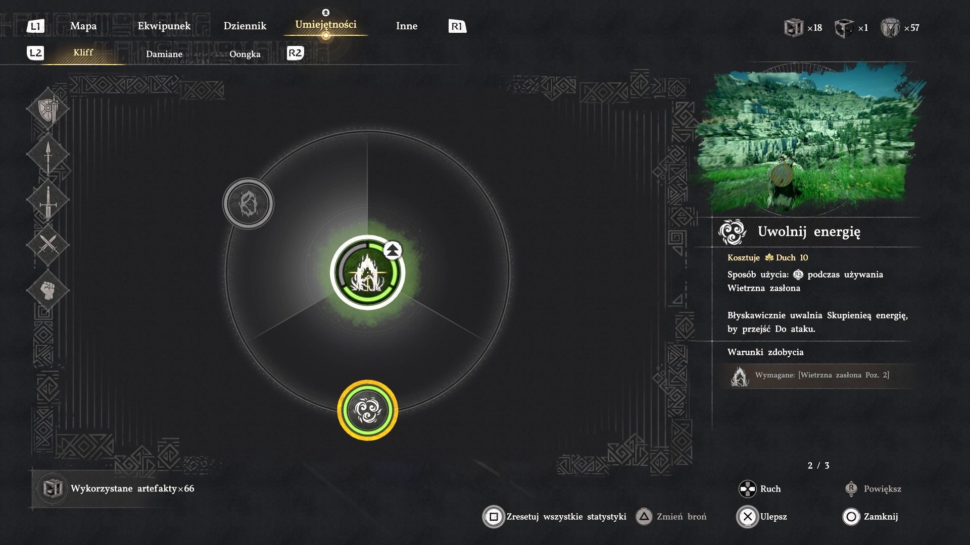 - Drugi sposób wymusza posiadanie umiejętności Wietrzna zasłona wraz z ulepszeniem Uwolnij energię. Do ich nabycia wymagane jest posiadanie zdolności Skupienie (rozwiniętej do co najmniej drugiego poziomu) oraz Wyostrzone zmysły (maksymalny trzeci poziom).