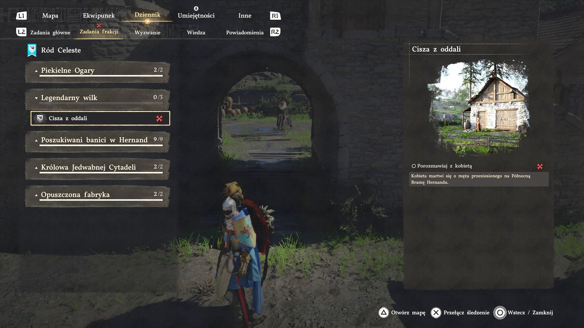 - Jeśli spełniliście powyższe wymagania, to powinniście automatycznie rozpocząć poboczny quest Cisza z oddali z nowej grupy zadań Legendarny wilk z kategorii Ród Celeste. Wyruszcie do lokacji Północna brama Hernand żeby spotkać się z kobietą i zająć się poszukiwaniami Czarnego Kła.