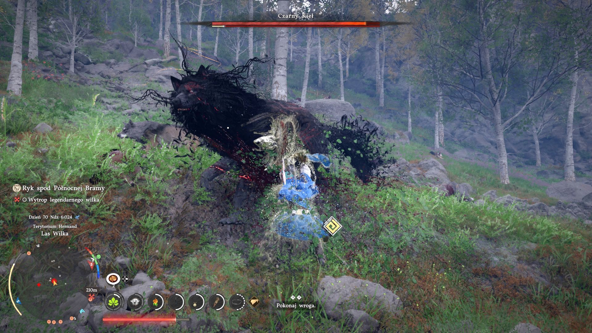- Czarnego Kła rozpoznacie po tym, że jest znacznie większym czarnym wilkiem. Towarzyszą mu też mniejsze "zwykłe" wilki i to nimi najlepiej zająć się w pierwszej kolejności. Spowoduje to, że nie będą Wam później przeszkadzać w atakowaniu bossa.