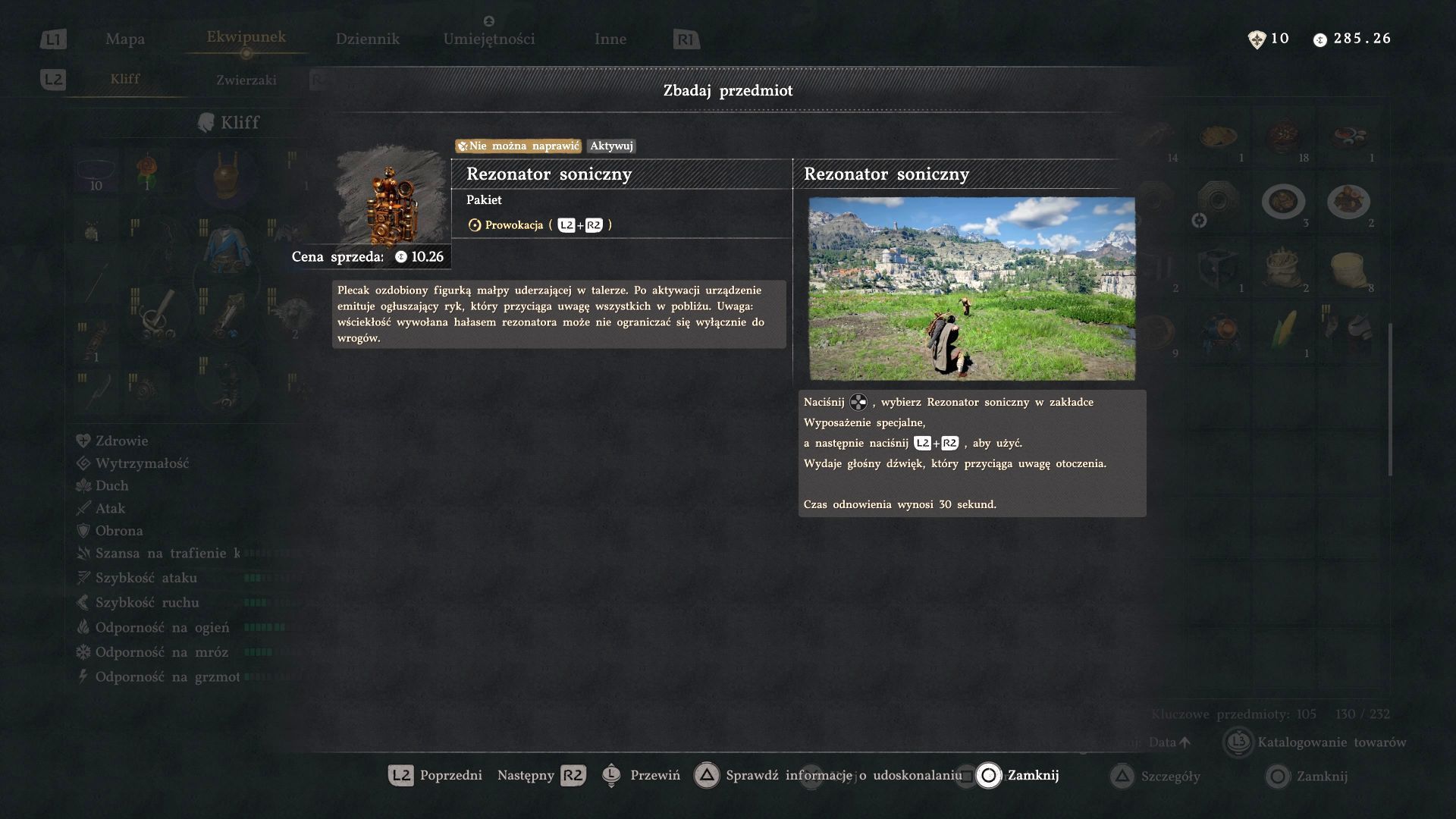 - Rezonator soniczny - Możecie go wybrać w slocie wyposażenia i jego aktywacja może ściągnąć uwagę wrogów i sprowokować ich do zaatakowania bohatera. Może się to przydawać w sytuacjach, gdy chcecie odciągać przeciwników od atakowania innych celów.
