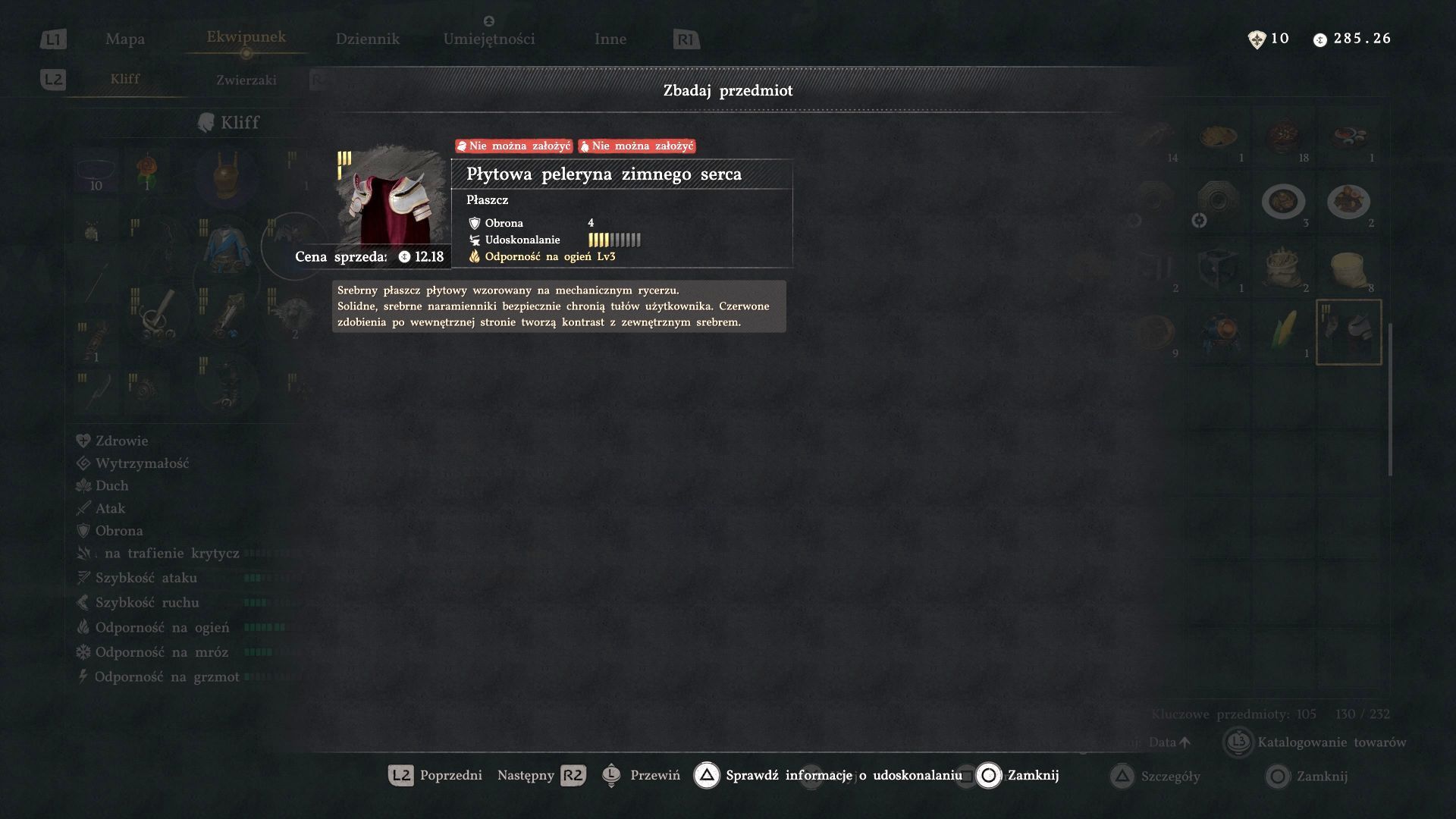 - Płytowa peleryna zimnego serca - Ma ona domyślnie 4 punkty obrony i gwarantuje ochronę przed ogniem (trzeciego poziomu).