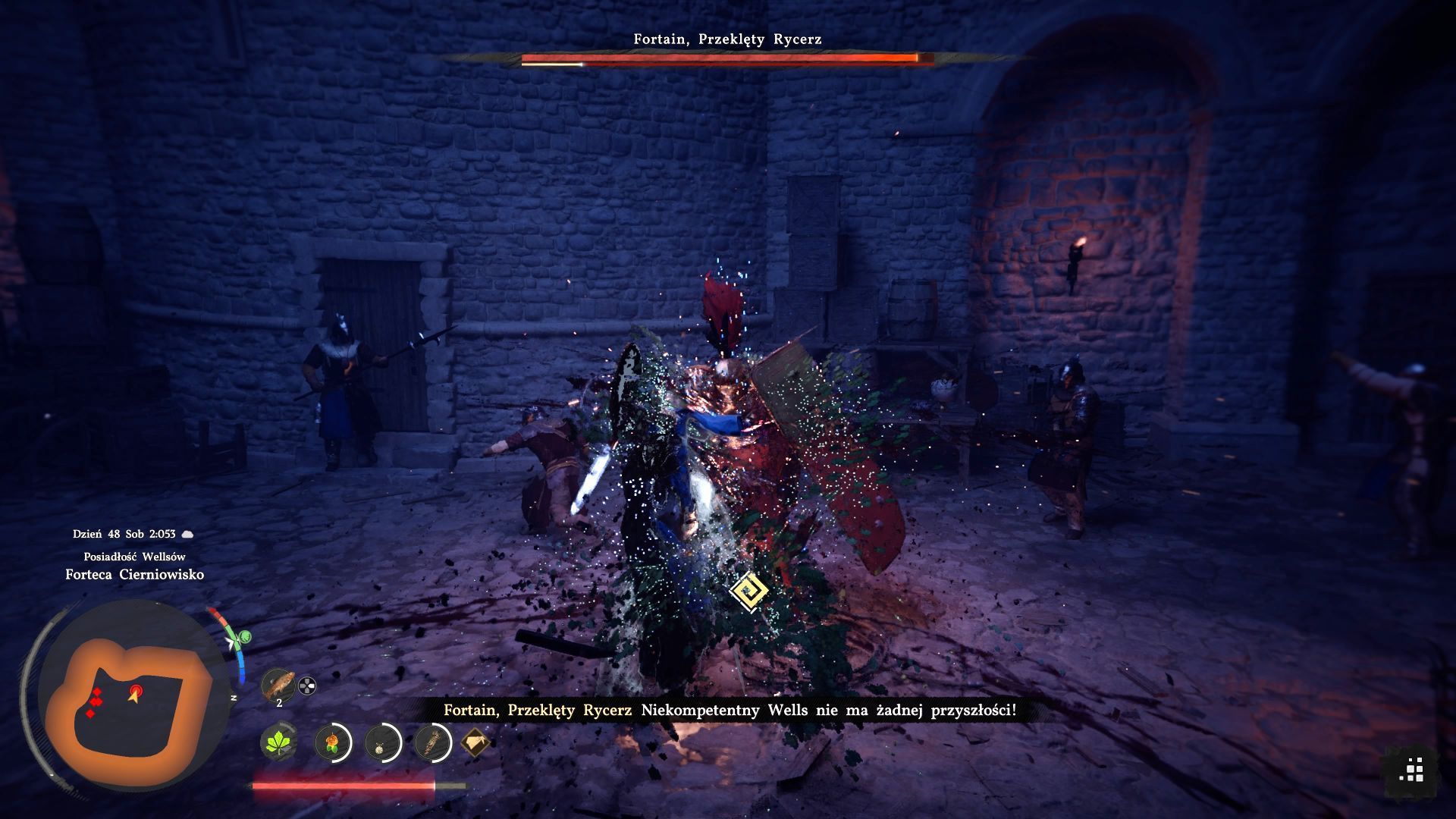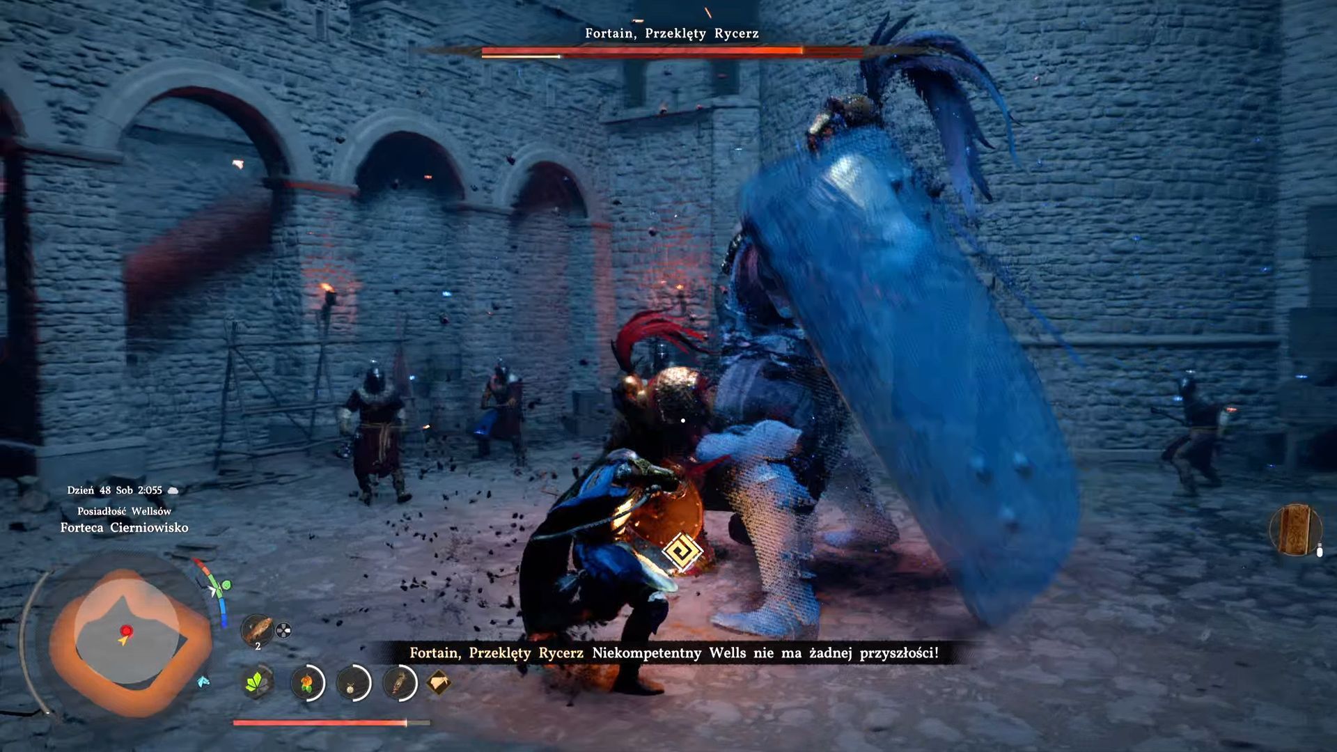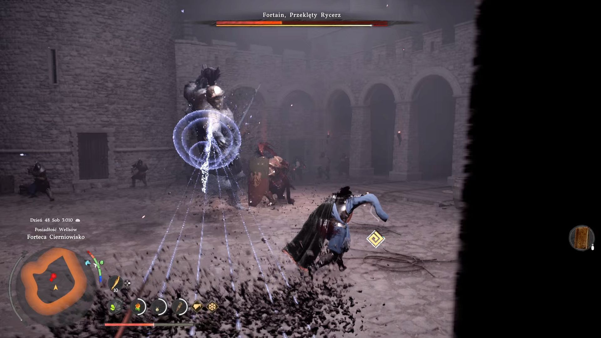 - Na Fortaina tradycyjnie dobrze działają parowania po zwykłych (nie czerwonych) atakach bossa, jak również oślepianie mieczem - ta druga akcja ułatwi Wam opuszczenie gardy przez Przeklętego rycerza, który domyślnie chowa się za wielką tarczą i utrudnia w ten sposób zadawanie obrażeń.