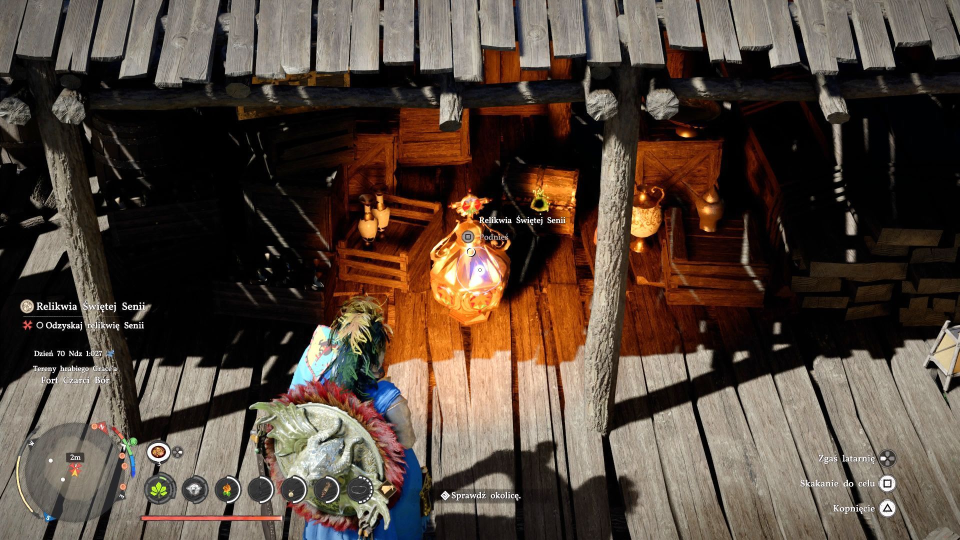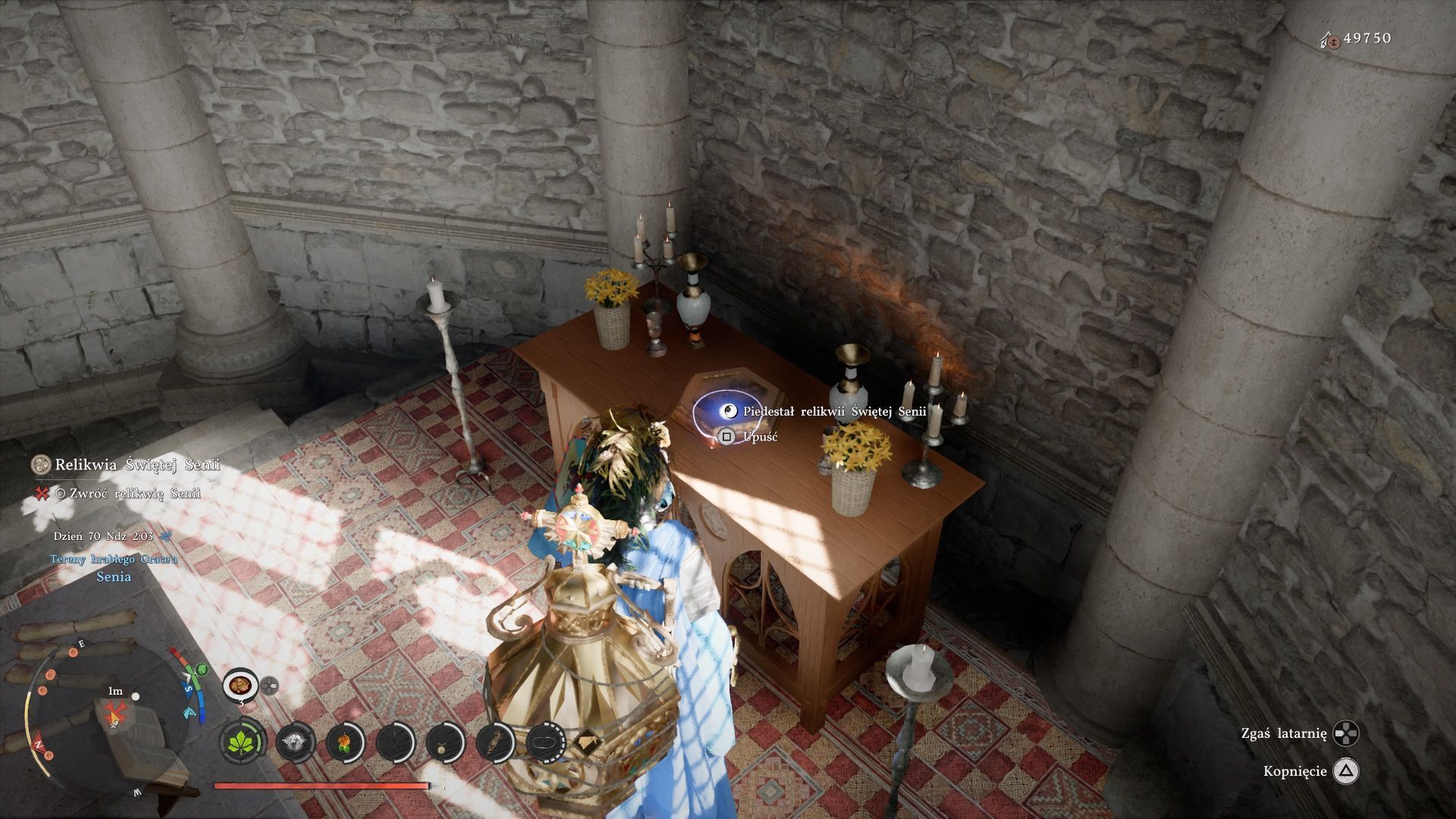 - Wejdźcie do kaplicy i wycelujcie w piedestał (powyższy obrazek) żeby pojawiła się akcja Upuść z umieszczenia relikwii.