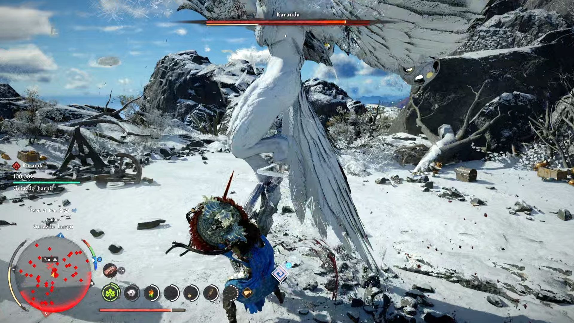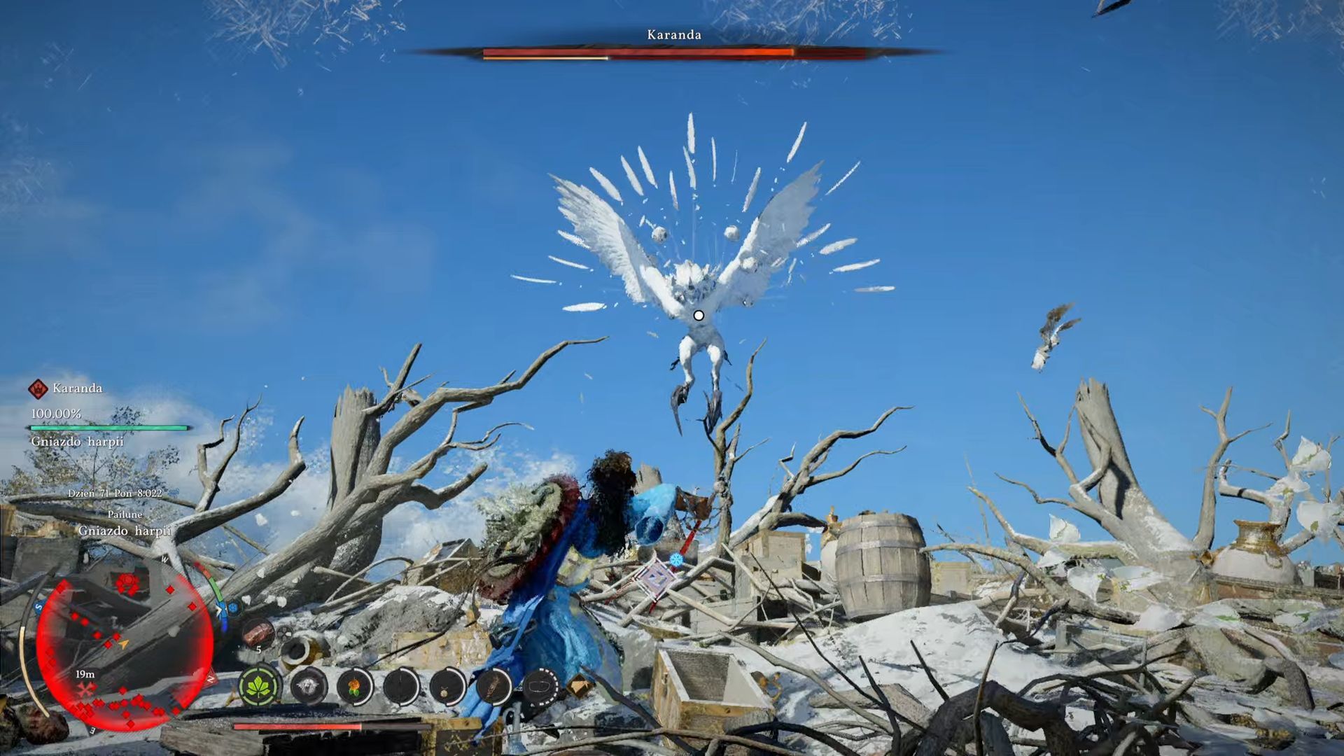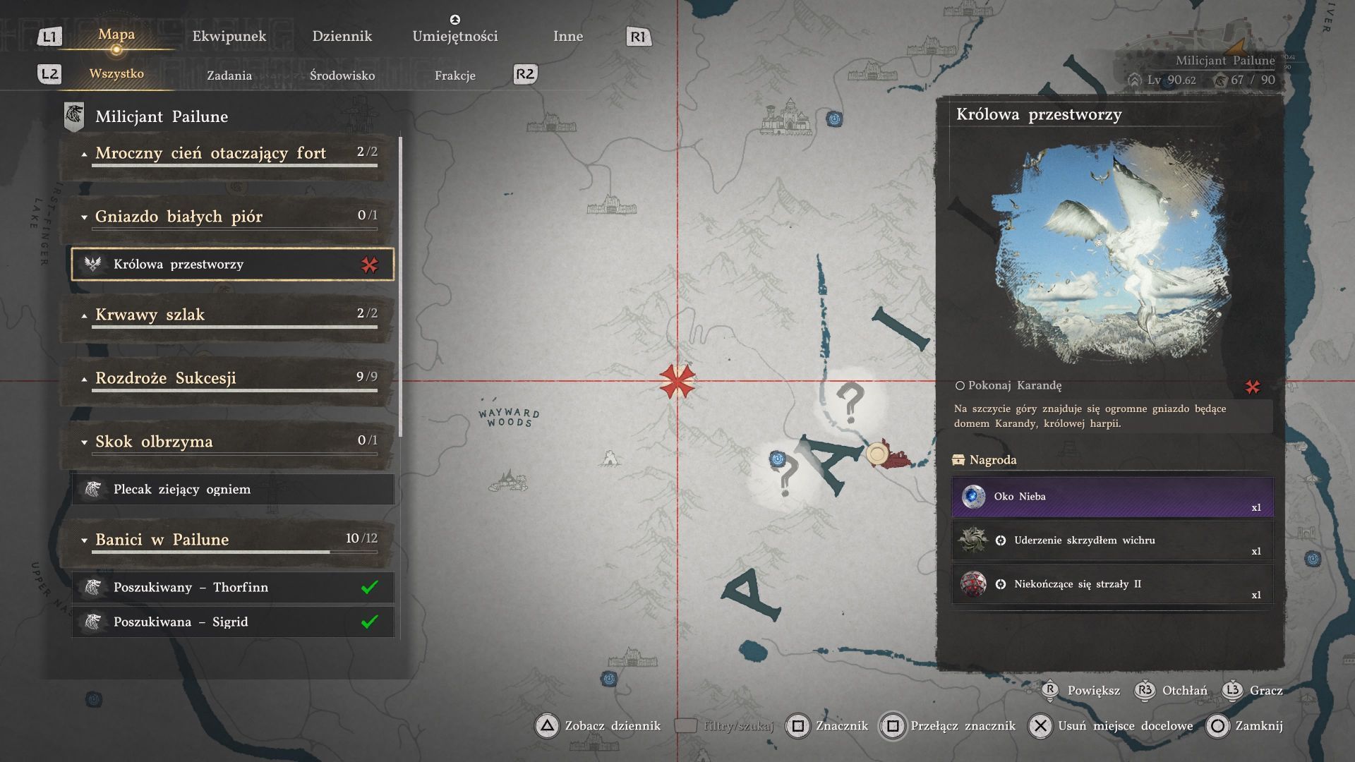 - Odnalezieniem i pokonaniem ogromnej harpii Karanda nie możecie zająć się w dowolnym momencie rozgrywki, bo trzeba najpierw spełnić określone wymagania. Musicie ukończyć wszystkie poboczne questy z linii fabularnej Rozdroże Sukcesji, wchodzącej w skład grupy Milicjant Pailune. Odblokuje to nową linię fabularną Gniazdo białych piór, w tym quest Królowa przestworzy z walki z opisywanym bossem.