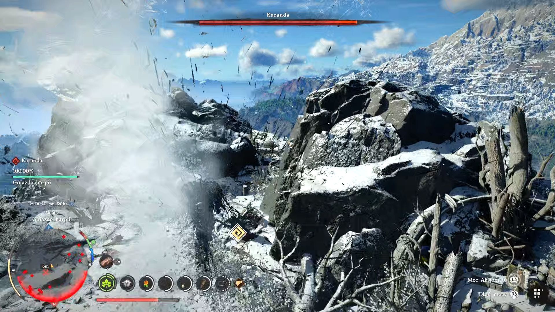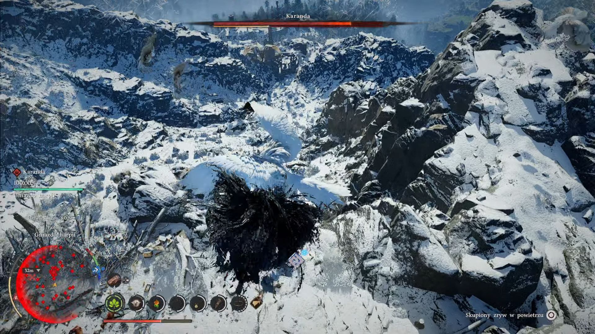- Po wylądowaniu na Karandzie możecie podjąć próbę użycia umiejętności Dźgnięcie (R1 + Trójkąt na padzie PlayStation, RB + Y na padzie Xbox, SHIFT + prawy przycisk myszy na PC). Pozwoli to na zadanie jednorazowych dużych obrażeń. Niestety jest tu spore ryzyko, że Karanda zdąży Was wcześniej zrzucić i w takiej sytuacji nie zapomnijcie aktywować lotu żeby nie zderzyć się z ziemią i nie zginąć.