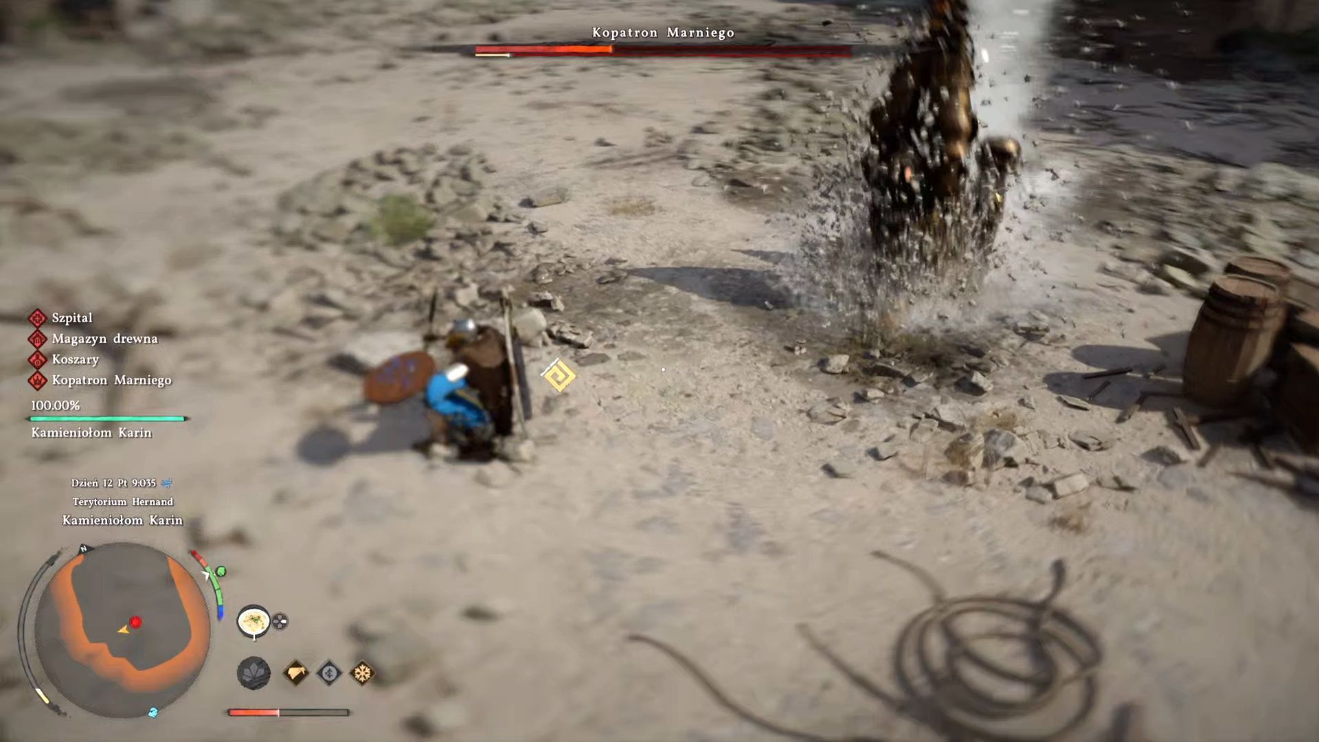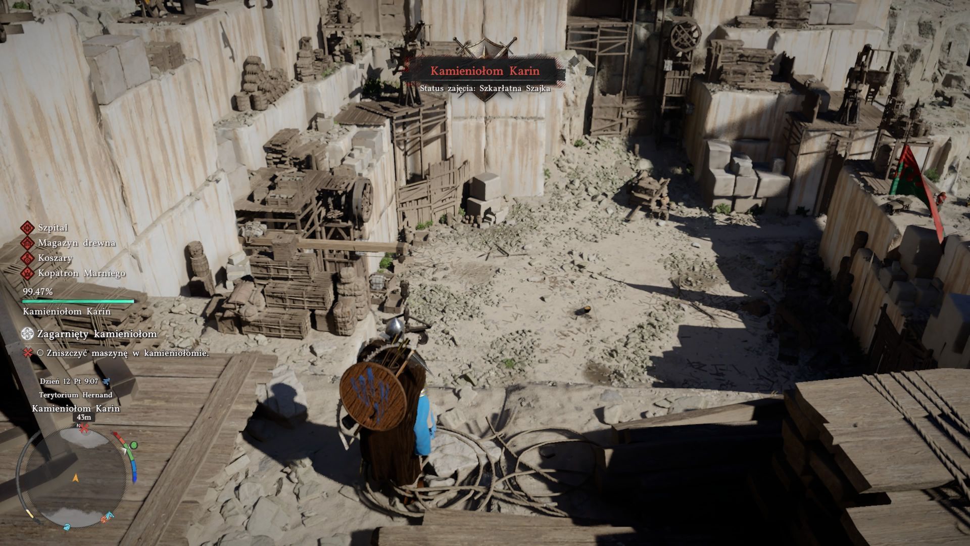 - Zauważcie, że pokonanie kopatrona nie zakończyło zadania, bo musicie jeszcze odbić cały kamieniołom. Rozgrywa się to oddzielnie i nie musicie się tym zajmować od razu po starciu z bossem. Możecie powrócić do kamieniołomu po uzupełnieniu zapasów.