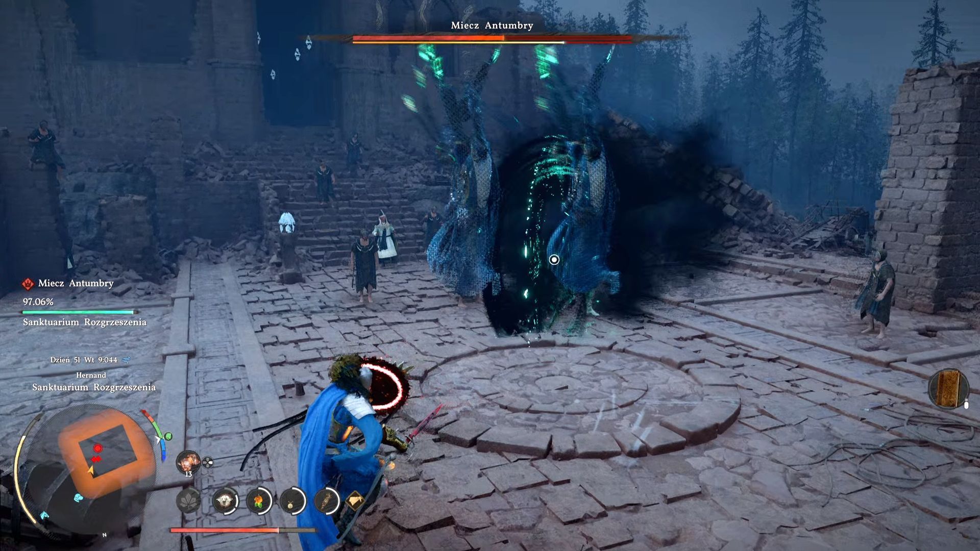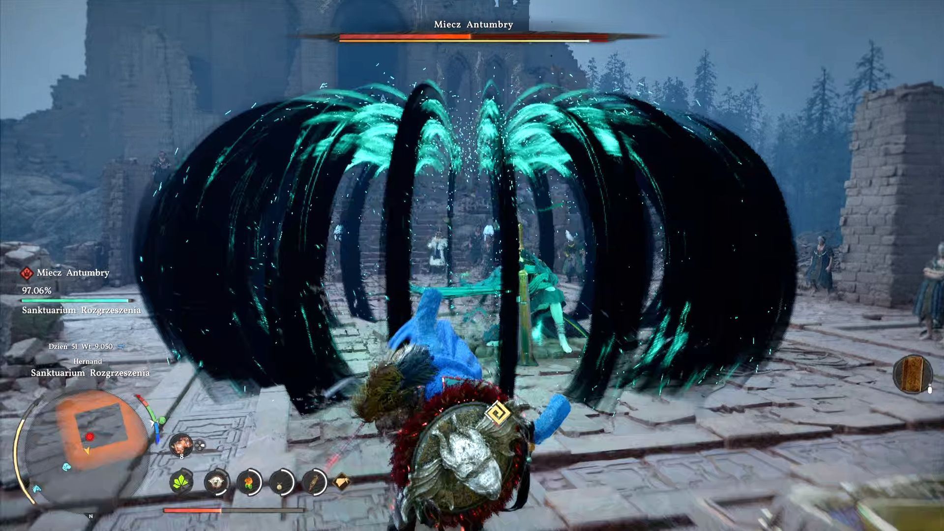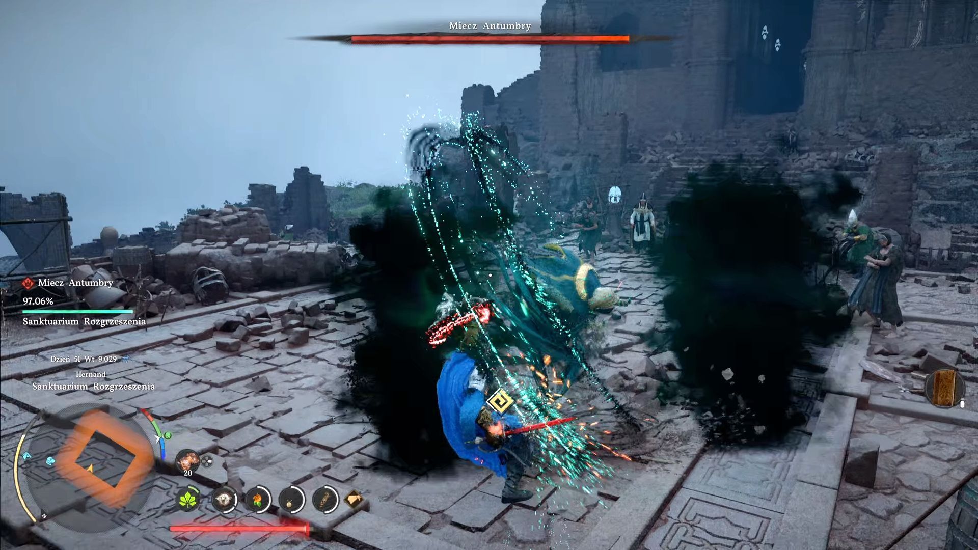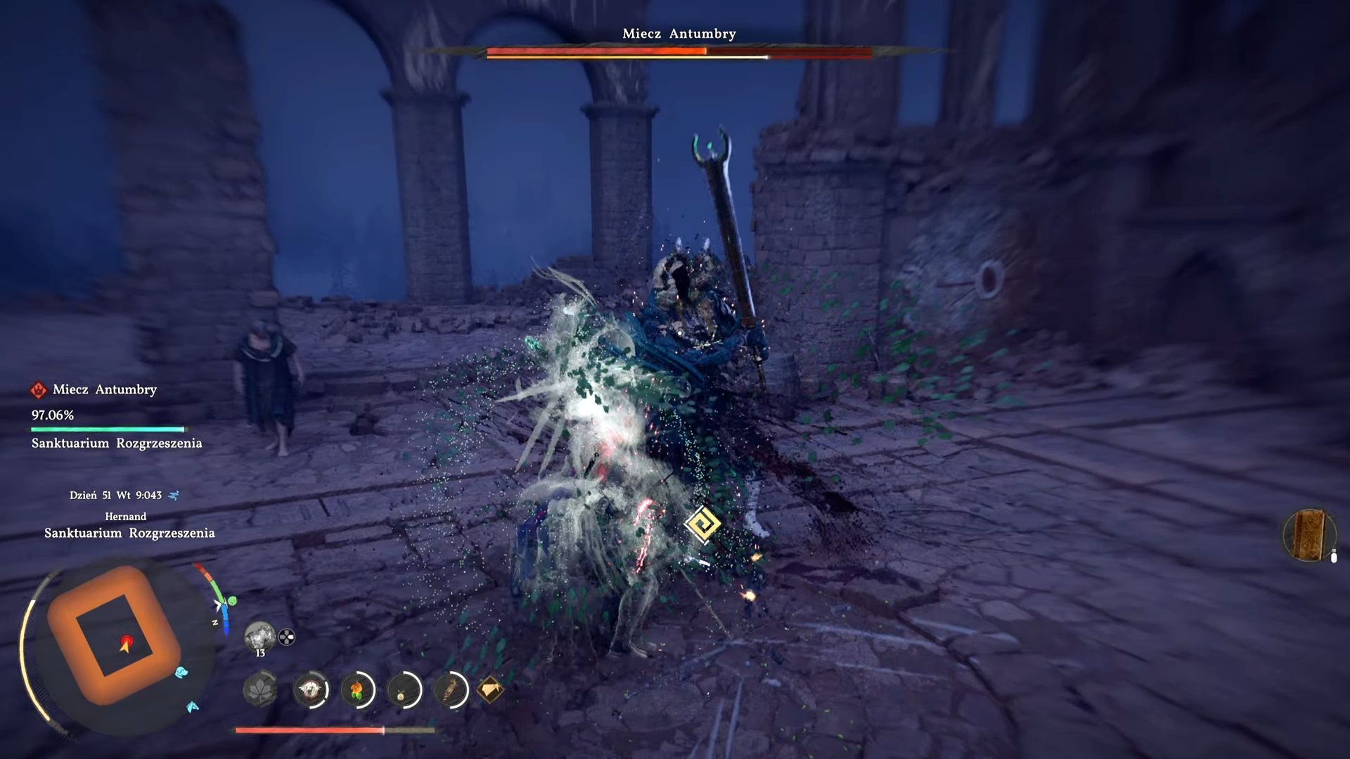 - Walka z bossem rozpocznie się po dotarciu na wyznaczoną arenę. Możecie mijać napotykanych fanatyków i zająć się nimi dopiero po rozprawieniu z Mieczem Antumbry. Boss ma 1 pasek zdrowia, ale jest bardzo wytrzymały i jego osłabianie może być powolnym procesem.