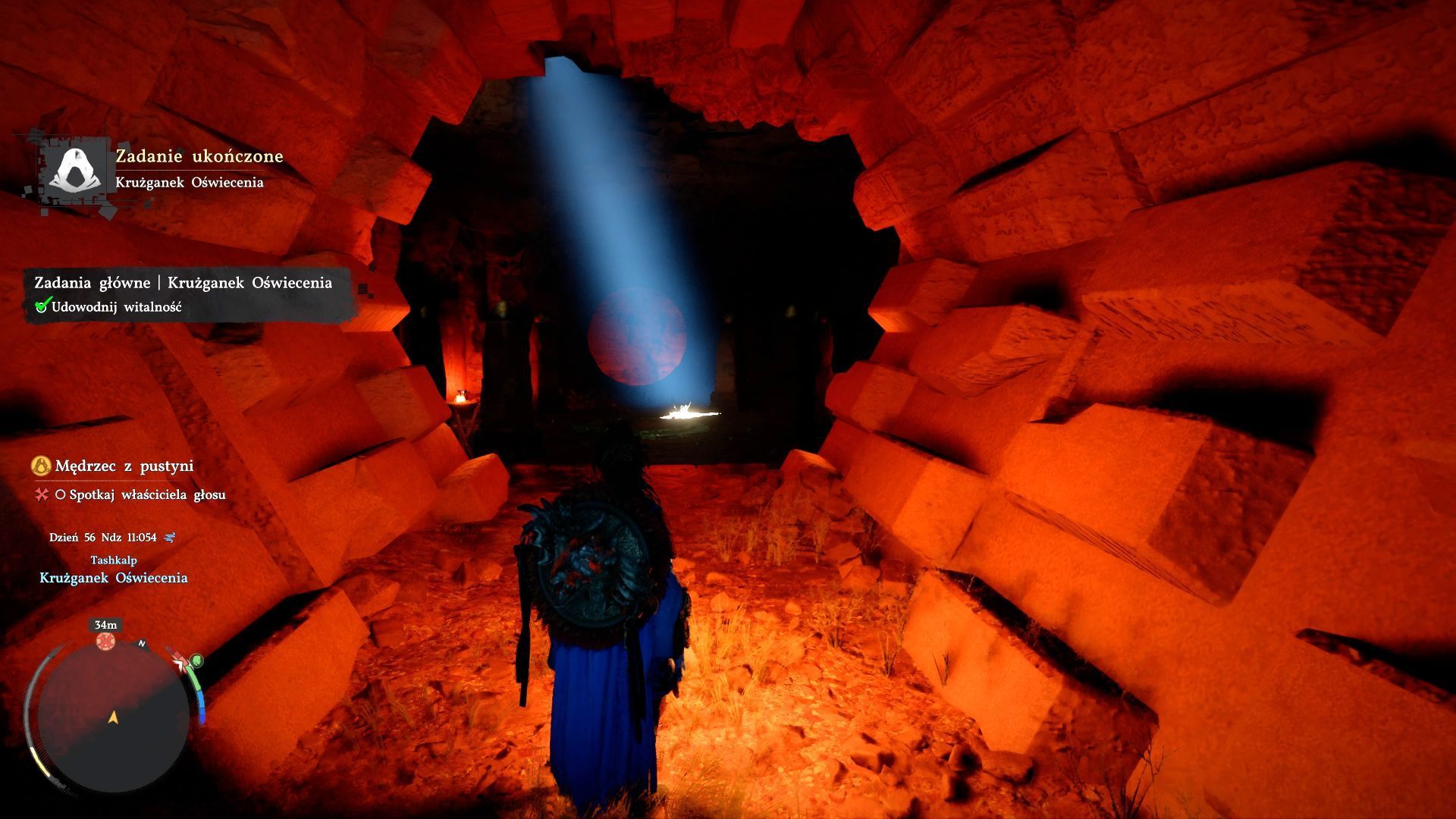 - Po odblokowaniu wszystkich przejść dotrzecie do pieczary z dołączonego obrazka. Rozpocznie się tu główny quest Mędrzec z pustyni. Wejście do jaskini odblokuje walkę z bossem. Koniecznie zadbajcie o zapas żywności i bolusów, bo Mistrz Du to silny i wymagający boss.