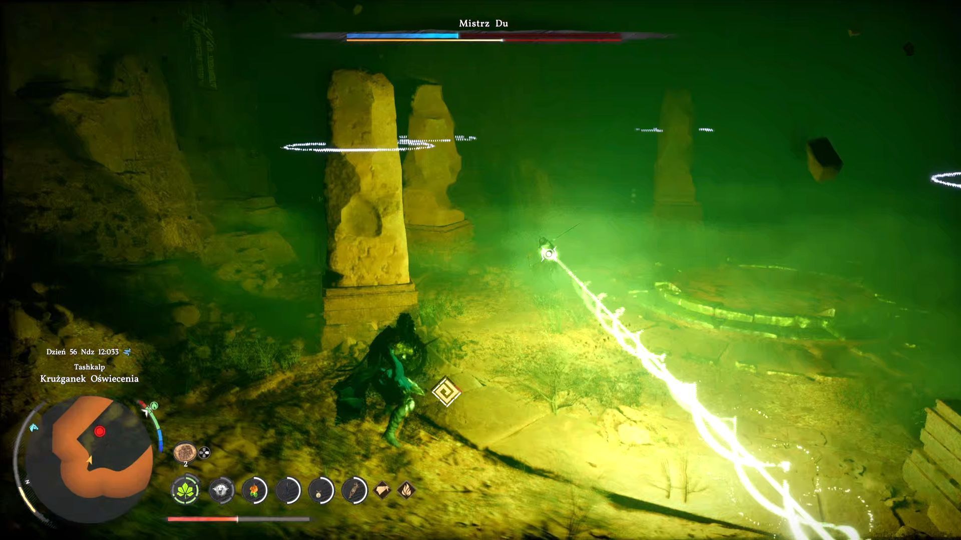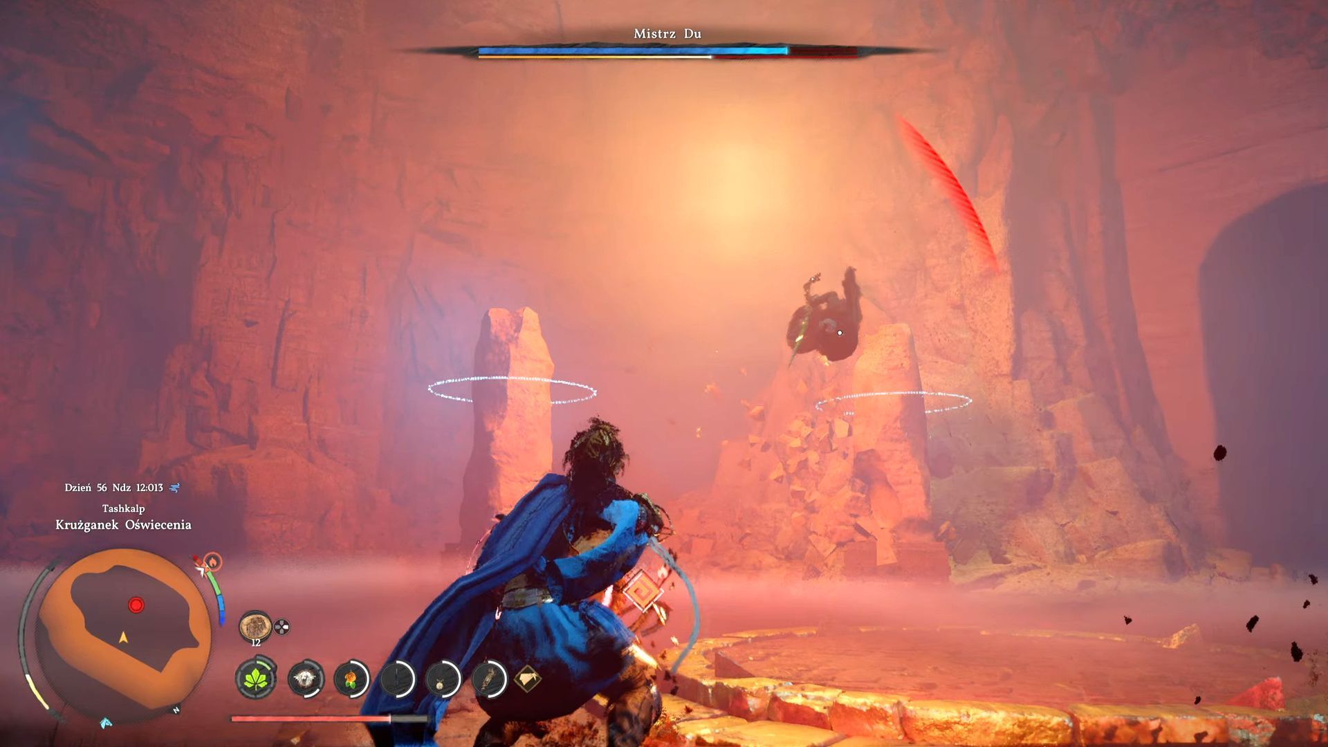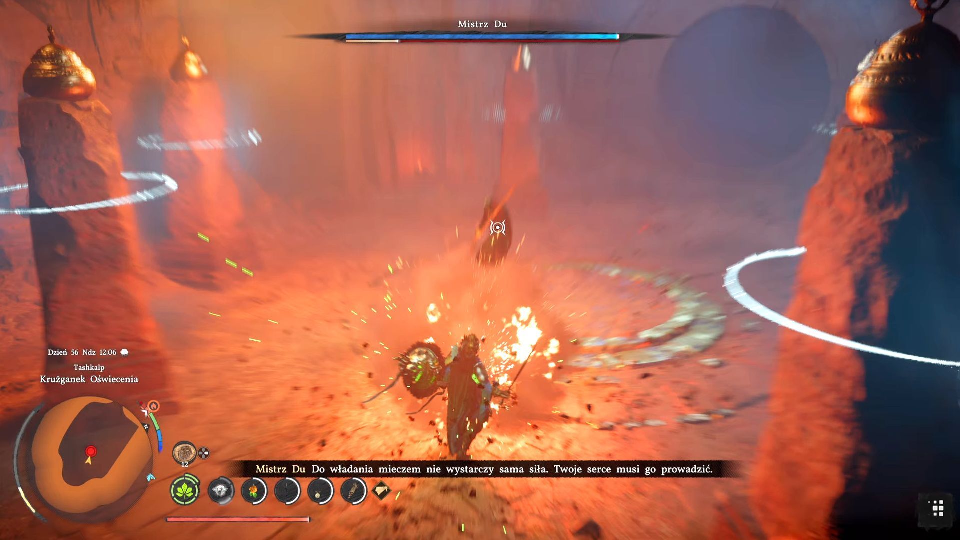 - Powinniście tu wykonać dwie rzeczy. Przede wszystkim wyłączcie chwilowo blokowanie kamery na bossie, bo może ona wariować próbując śledzić Mistrza Du. Dodatkowo przygotujcie się do uniku w odpowiedzi na uderzenie w arenę przez bossa. Jest to sygnalizowane i powinniście mieć wystarczająco dużo czasu na poprawny uskok.