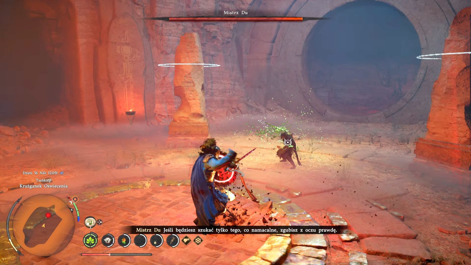 - Starcie z Mistrzem Du czeka Was pod sam koniec dziewiątego rozdziału. Bohater musi odwiedzić lokację Krużganek Oświecenia i zaliczyć najpierw próby udowodnienia siły, ducha i witalności. Upewnijcie się, że macie wystarczająco długie paski zdrowia, ducha i wytrzymałości i w razie potrzeby odblokujcie powiązane z nimi pasywne umiejętności.