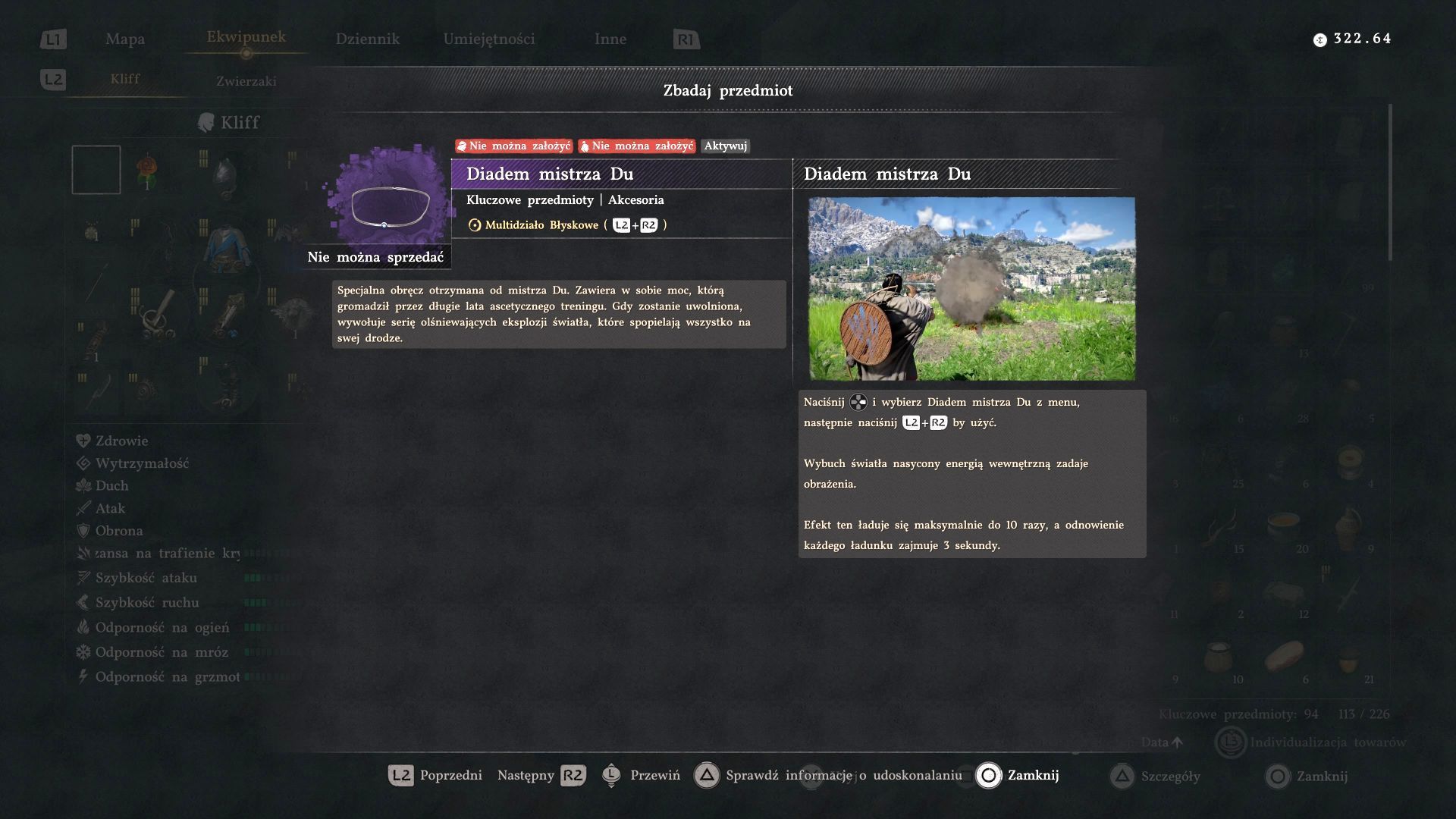 - Diadem mistrza Du - znajdziecie go w kategorii Kluczowe przedmioty / Akcesoria. Po wybraniu go w menu wyposażenia można aktywować Multidziało błyskowe i doprowadzić do wybuchu światła, zdolnego do zadania poważnych obrażeń.