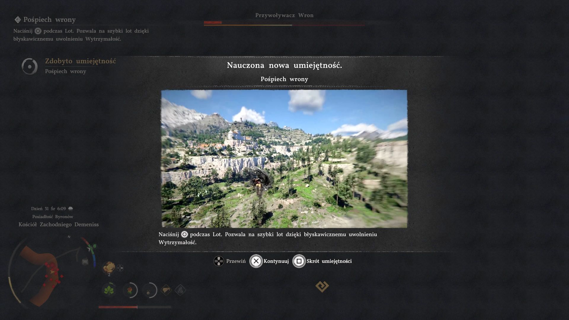 - Podczas tej walki możecie nauczyć się umiejętności Pośpiech wrony. Polega ona na wciśnięciu przycisku uniku w trakcie lotu, by szybko polecieć w wybranym przez siebie kierunku. Nie przyda się to Wam jeszcze w tej konkretnej walce, ale może to być pomocne np. w trakcie eksploracji świata. Niestety każda aktywacja tej akcji zużyje sporą część wytrzymałości.