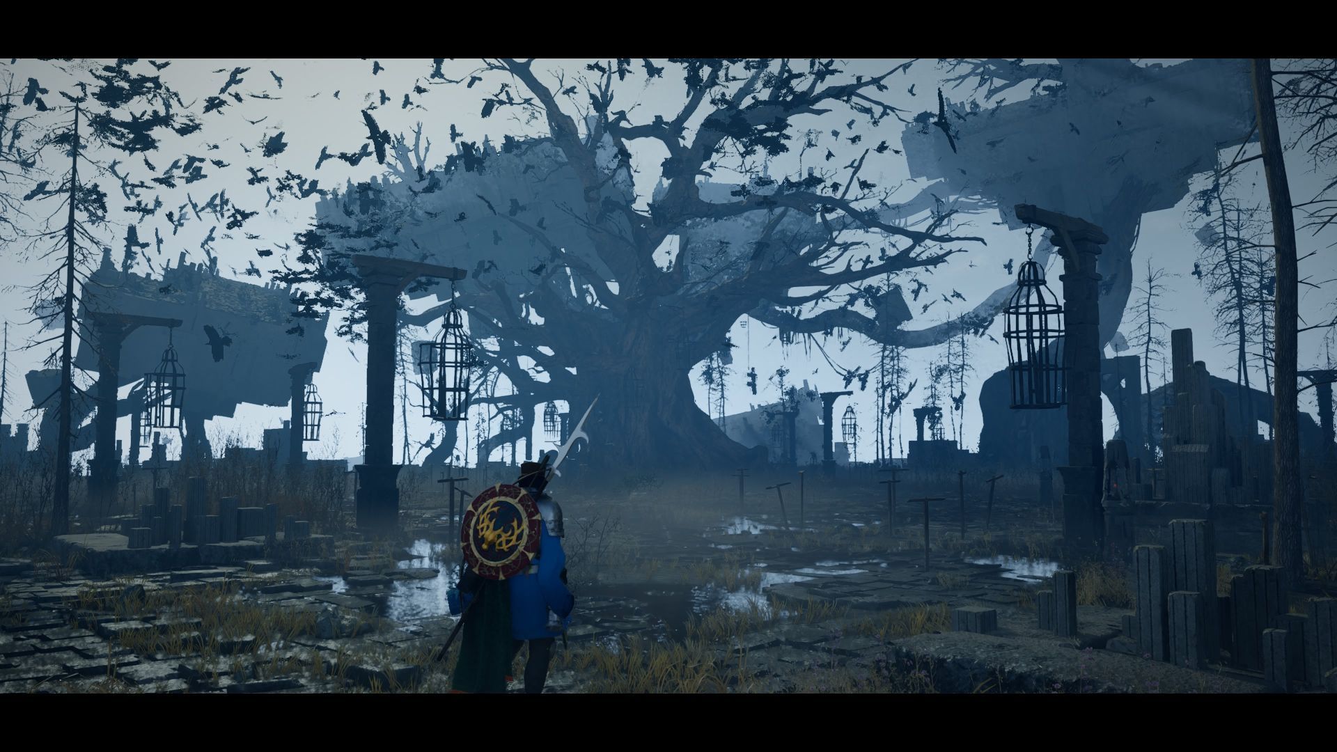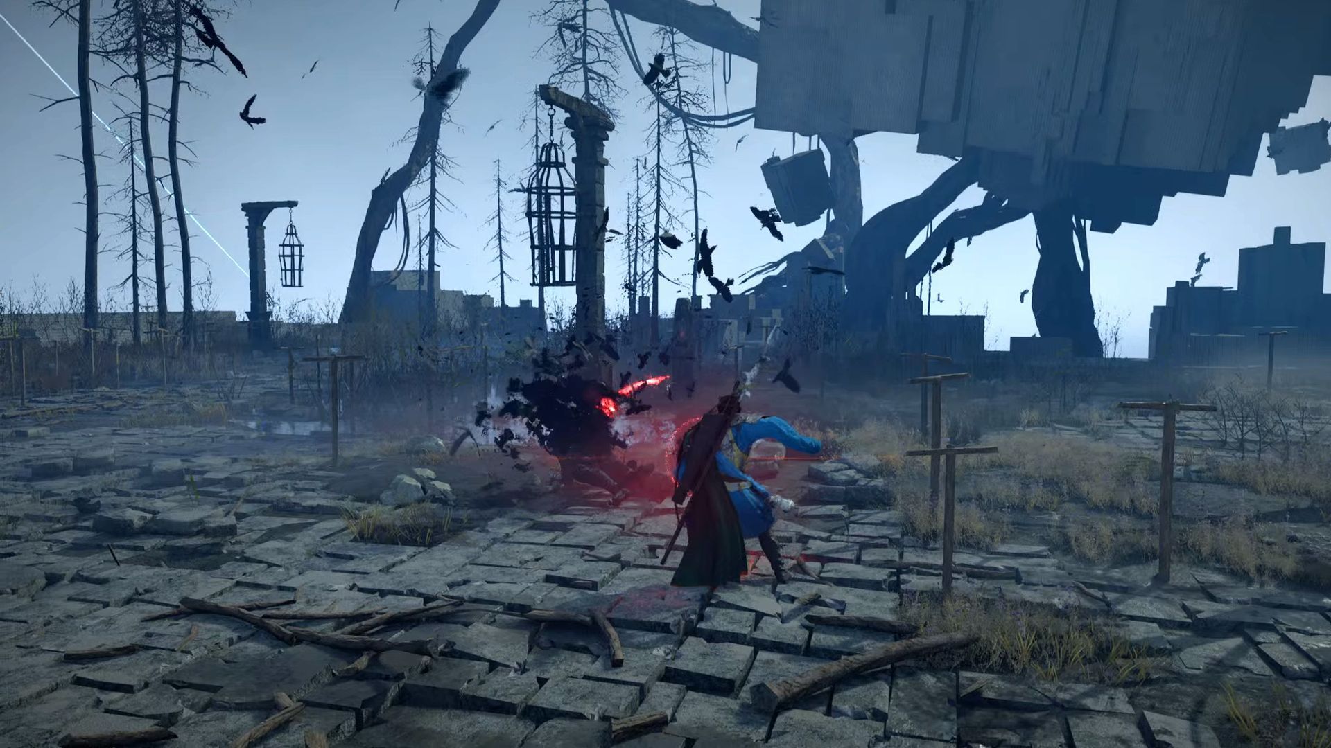 - Docelowo musicie dotrzeć do Kościoła Zachodniego Demeniss. Zbadajcie okolice cmentarza, a znajdziecie splot Otchłani. Po zbliżeniu się do północnych budynków załączy się scenka przerywnikowa. Najpierw musicie rozprawić się z grupą zwykłych wrogów. Dopiero wtedy pojawi się Przywoływacz Wron i rozpoczniecie pierwszą walkę z tym bossem.