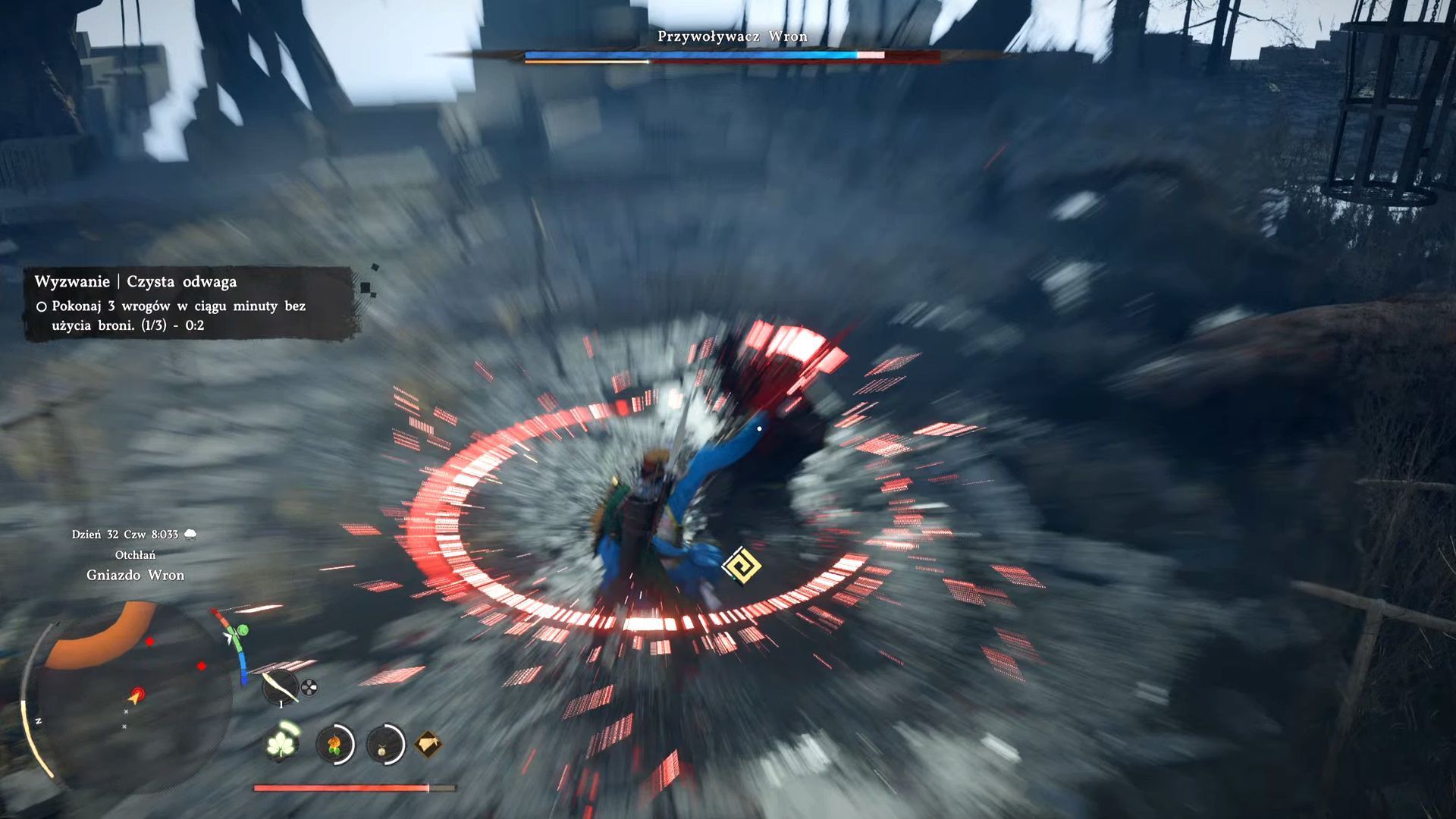 - Przywoływacza Wron trzeba 3 razy pozbawić paska zdrowia - kolejno niebieskiego, zielonego i czerwonego. Każda faza pojedynku rozegra się w osobnej części Gniazda wron i będą one przedzielone krótkimi scenkami przerywnikowymi (nie ma w nich QTE).