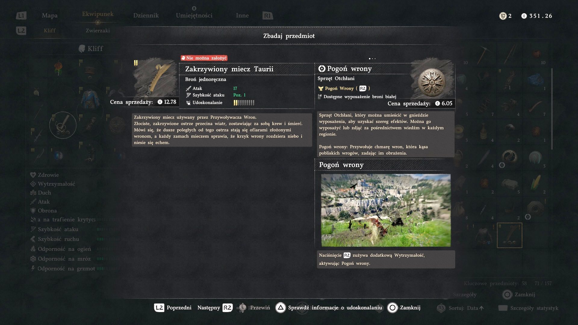 - Zakrzywiony miecz Taurii - Zamontowany w nim sprzęt Otchłani pozwala na specjalny atak Pogoń wrony. Aktywuje go przycisk ciężkiego ataku - możecie nasłać chmarę wron na pobliskich wrogów kosztem zużycia większej ilości wytrzymałości.