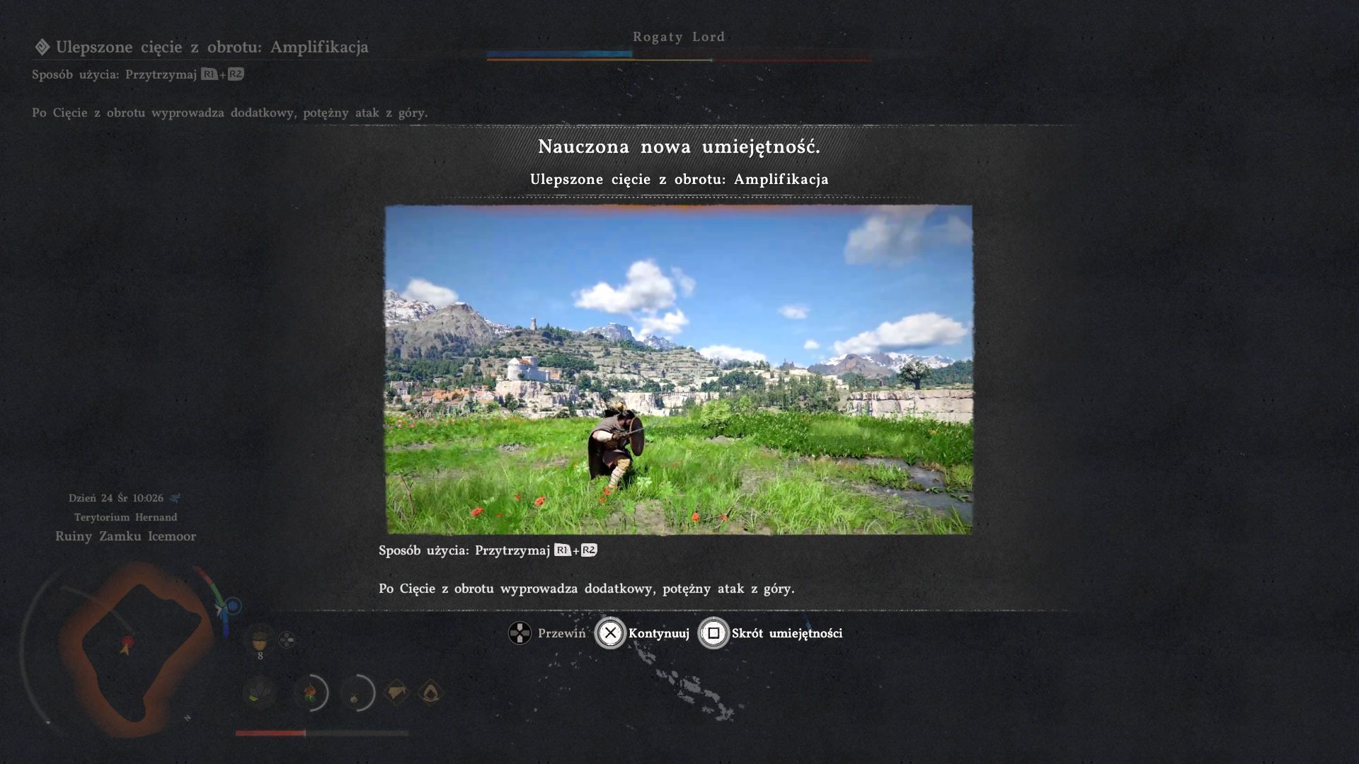 - Podczas walki powinniście automatycznie nauczyć się nowego ataku - Ulepszone cięcie z obrotu: amplifikacja. Jest on aktywowany przytrzymaniem kombinacji przycisków R1+R2 / RB+RT i również wykazuje się dużą skutecznością w osłabianiu Rogatego Lorda.