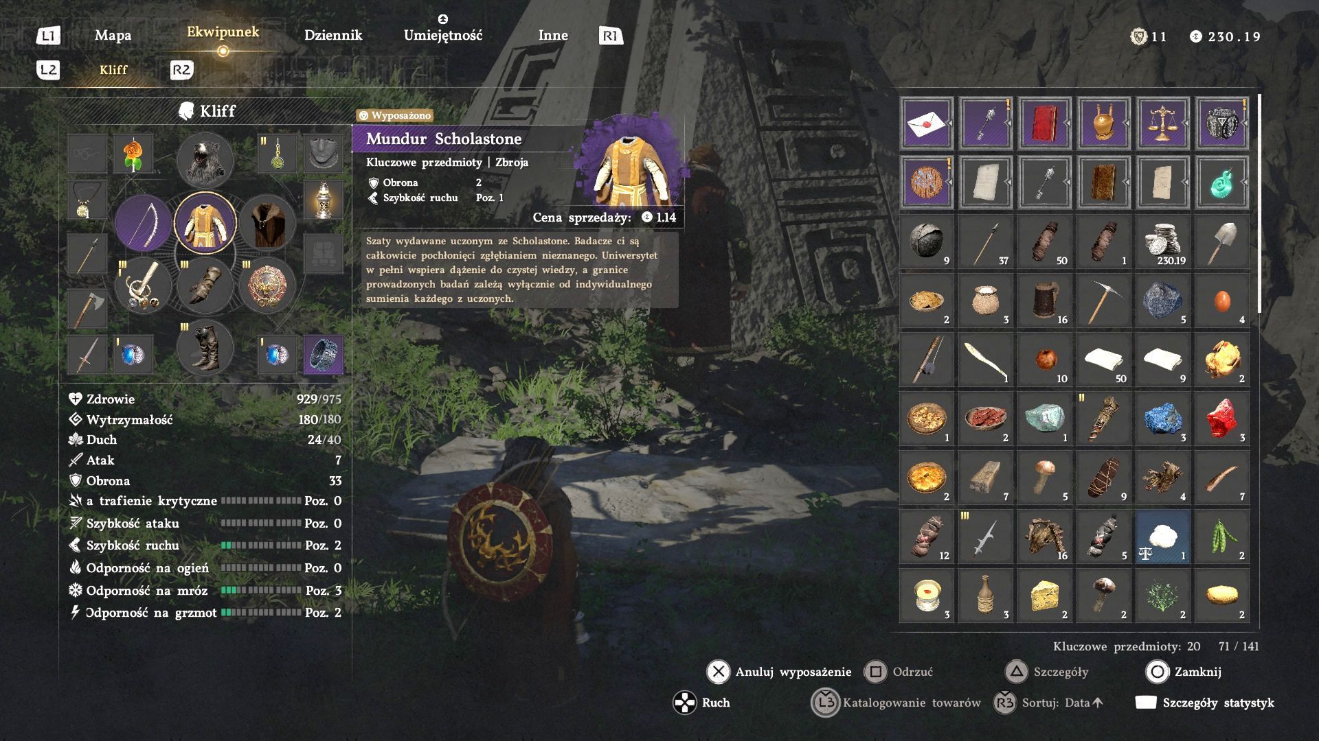 - Po zniszczeniu przeszkód ze skał trzeba założyć w inwentarzu mundur Scholastone. To unikalny strój, który otrzymaliście na początku questu i musi on tymczasowo zastępować Waszą główną zbroję.