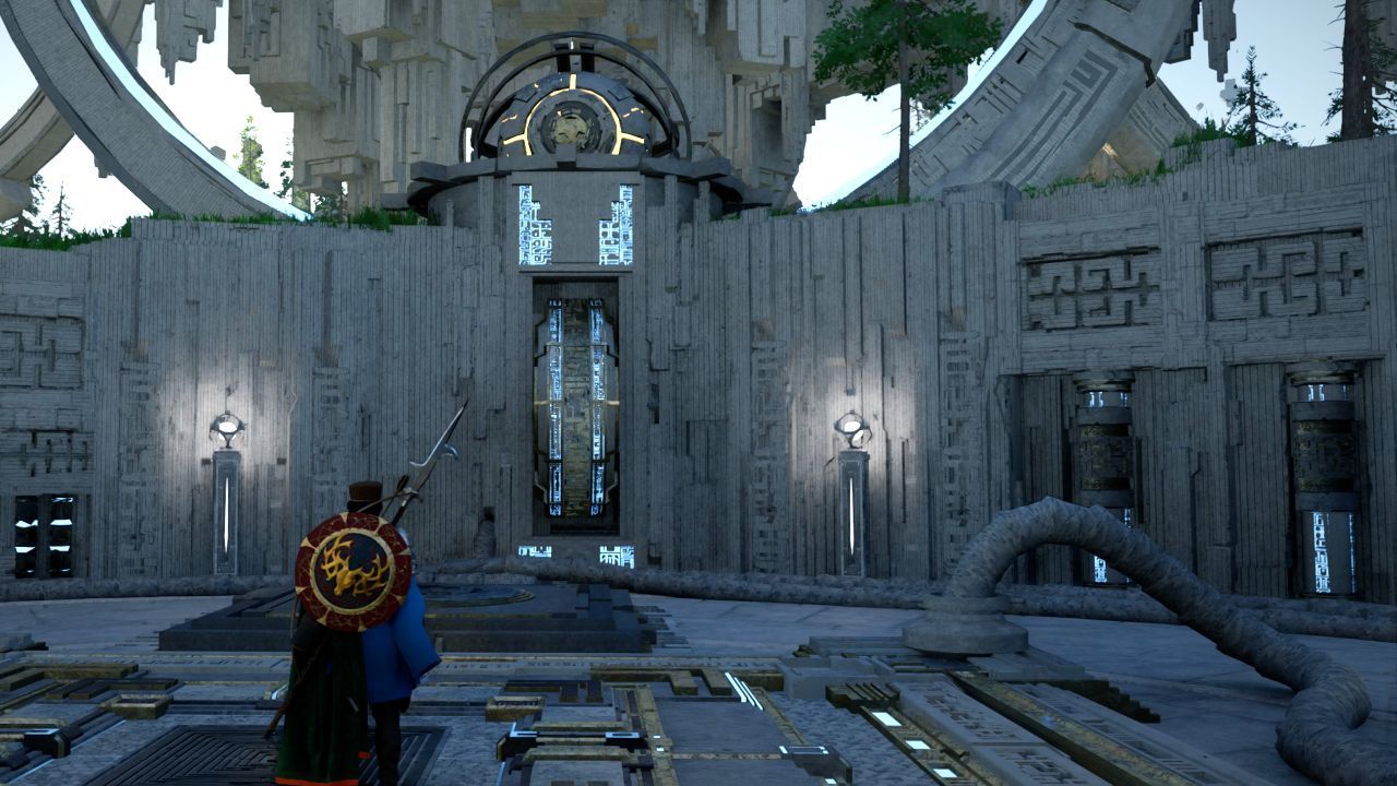 - Ostatnia zagadka polega na przejściu przez podniebną bramę z obrazka 1. Po wykonaniu tej akcji użyjcie aksjomatu na małym mechaniźmie. Musicie wykonywać drobne korekty żeby znaleźć właściwe położenie - urządzenie zaświeci się na niebiesko (obrazek 2).