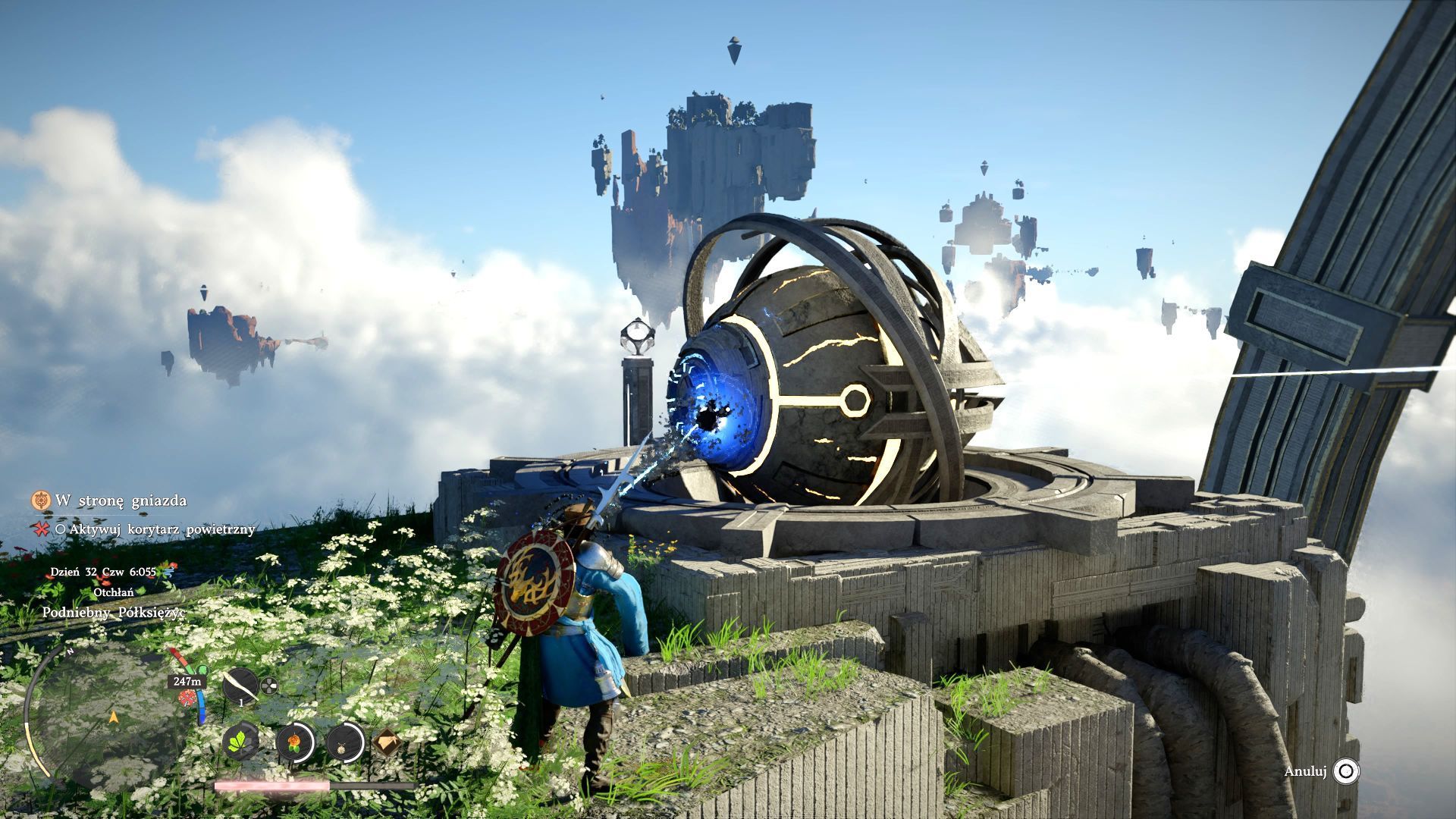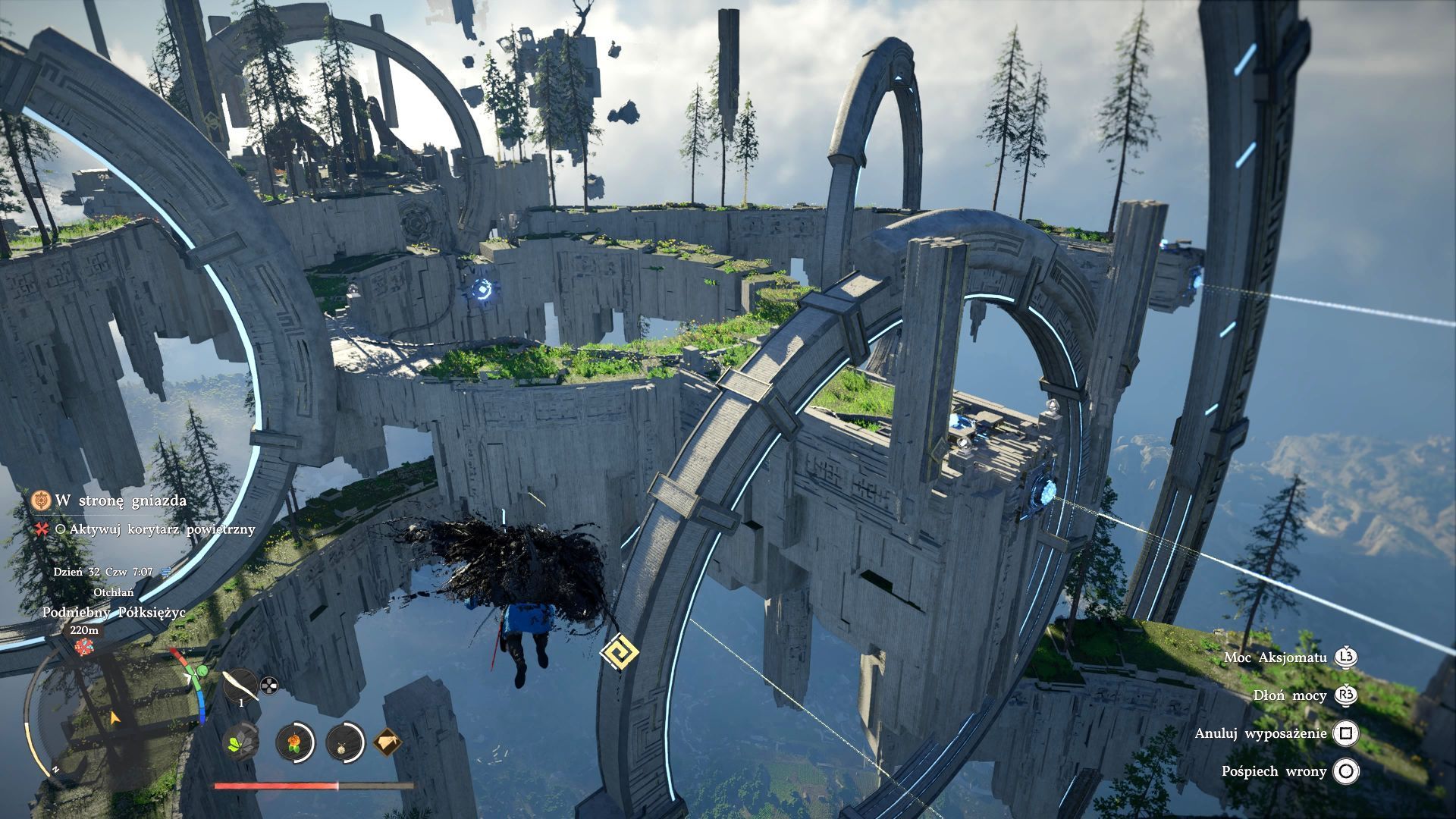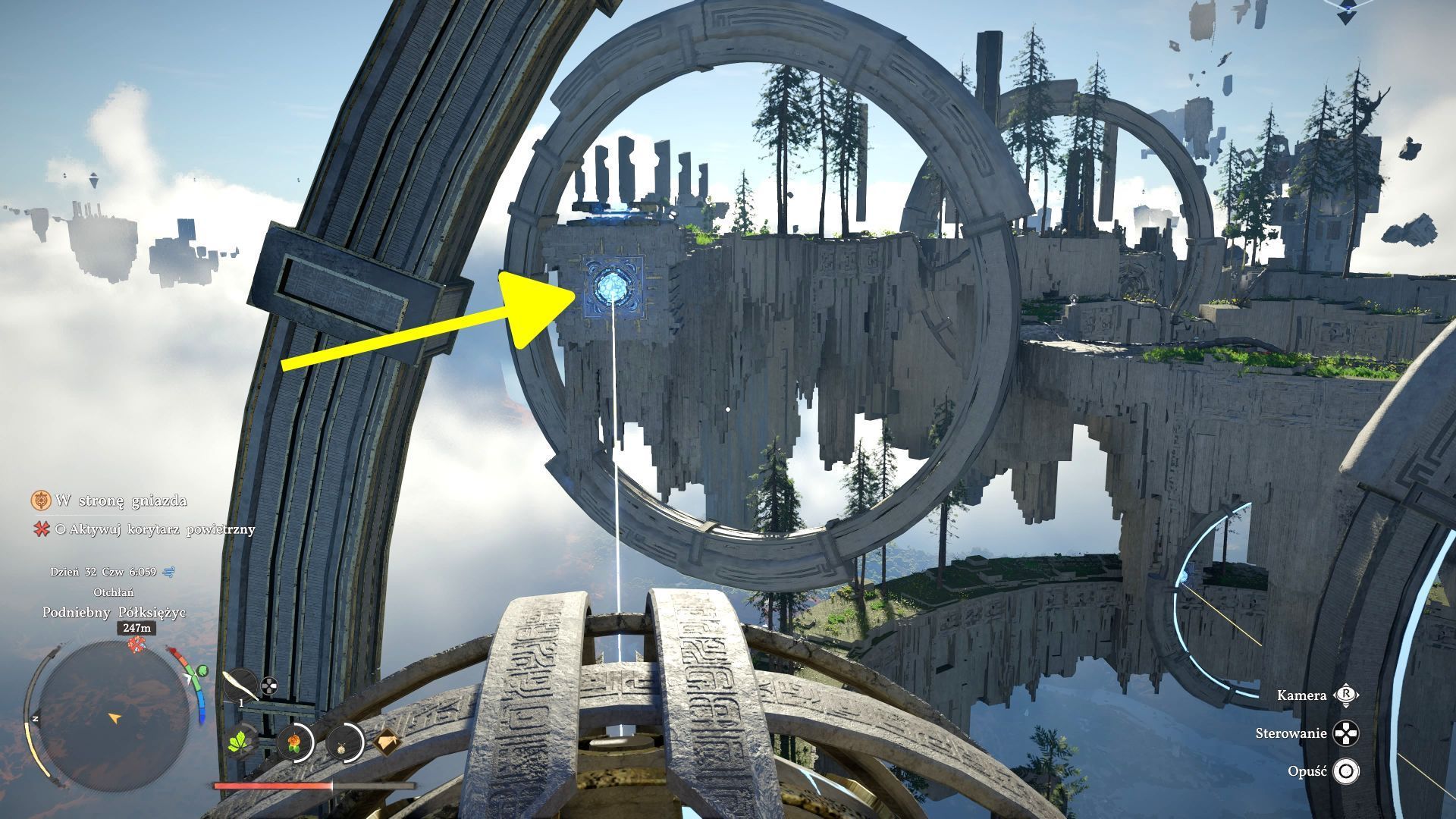 - Po prawidłowym ustawieniu 2 górnych sfer możecie poszybować do kolejnej części Podniebnego Półksiężyca, która jest na wschód od miejsca startu. Upewnijcie się, że rozpoczęliście lot blisko celu podróży żeby wystarczyło Wam wytrzymałości. Możecie też przed lotem ponownie się wybić z pomocą Dłoni mocy: Skoku.