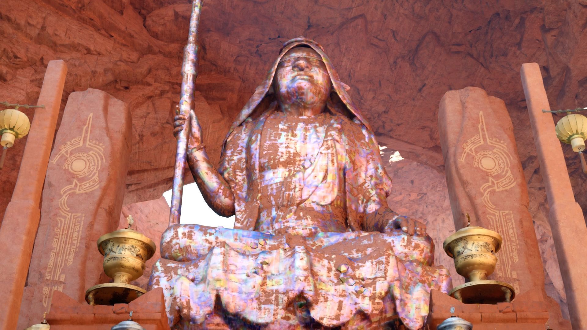 - Cel misji z oczyszczania złotych posągów otrzymacie na samym początku rozdziału 9, po dotarciu do regionu Karmazynowa Pustynia i niedługo po odblokowaniu głównego zadania Nieznany głos. Musicie wkroczyć do lokacji o nazwie Krużganek Oświecenia, rozpoczynając zadanie o tej samej nazwie.