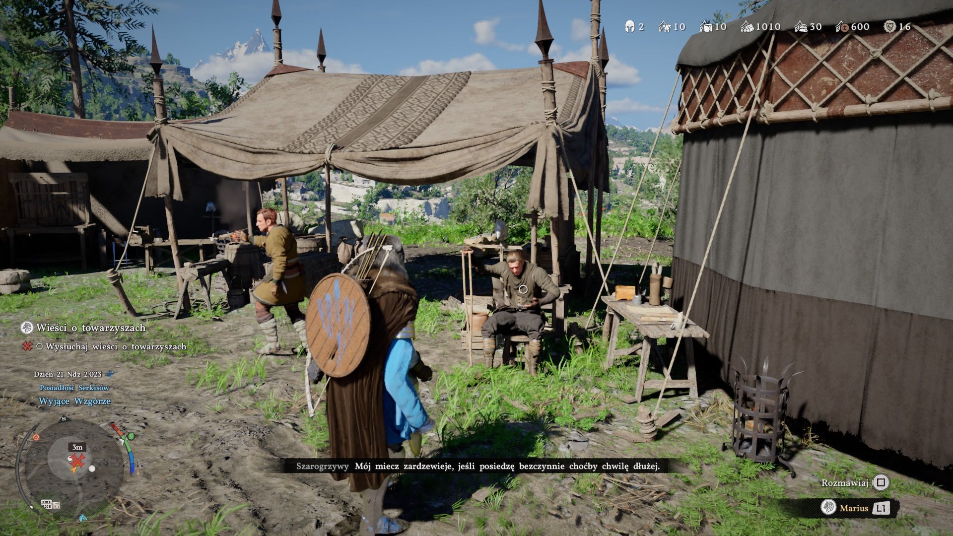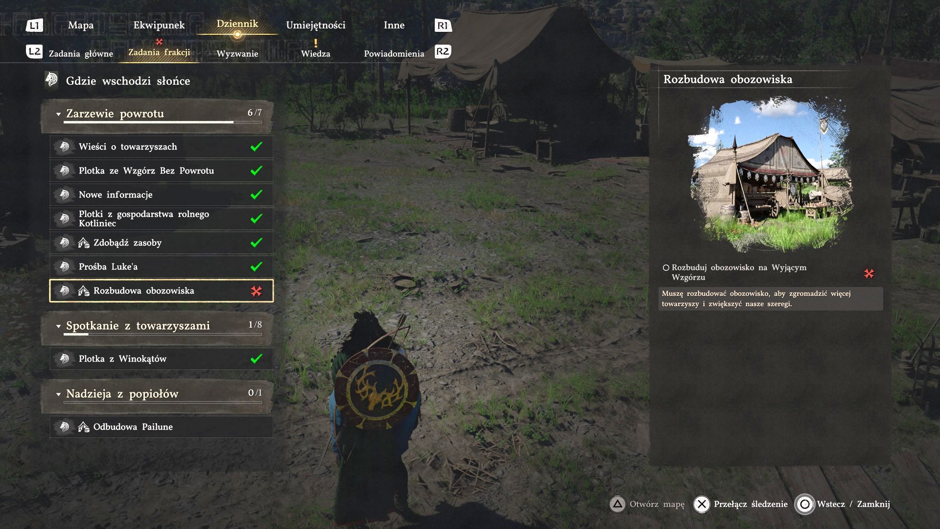 - Musicie najpierw po raz pierwszy rozbudować obóz Wyjące Wzgórze i jest to częścią głównej fabuły (quest Wzgórze tętniące życiem z rozdziału 3). Począwszy od rozdziału 4 możecie ponownie spotykać się z Mariusem w obozie i wypytywać go na temat plotek o Szarogrzywych przebywających w okolicy. Pierwszy tego typu quest to Wieści o towarzyszach i jest on częścią nowej grupy zadań Gdzie wschodzi słońce w Waszym dzienniku.