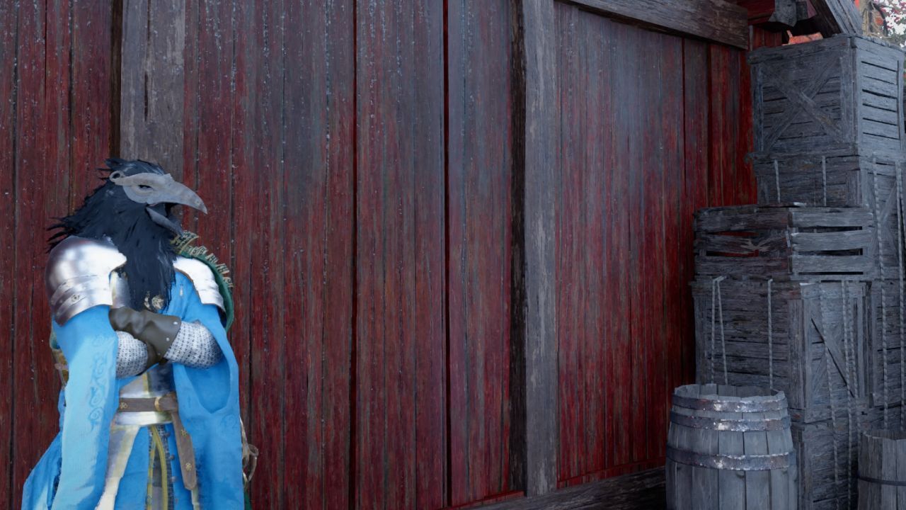 - Drugie podsłuchanie rozmowy jest wymagane nieco później w tym samym zadaniu. Ponownie musicie oprzeć się o ścianę budynku, obok dużej drewnianej podpory. Tym razem pozyskacie wiedzę o Niebieskich Kłach.
