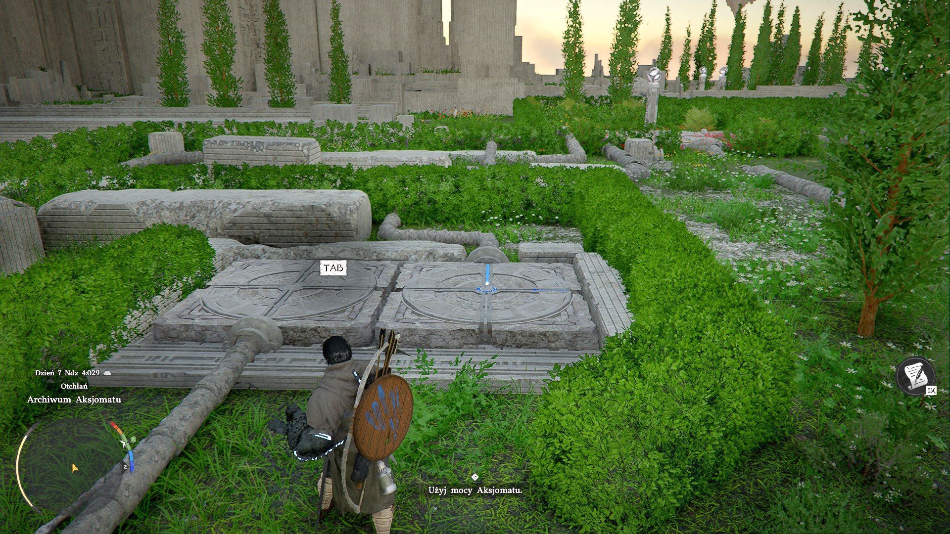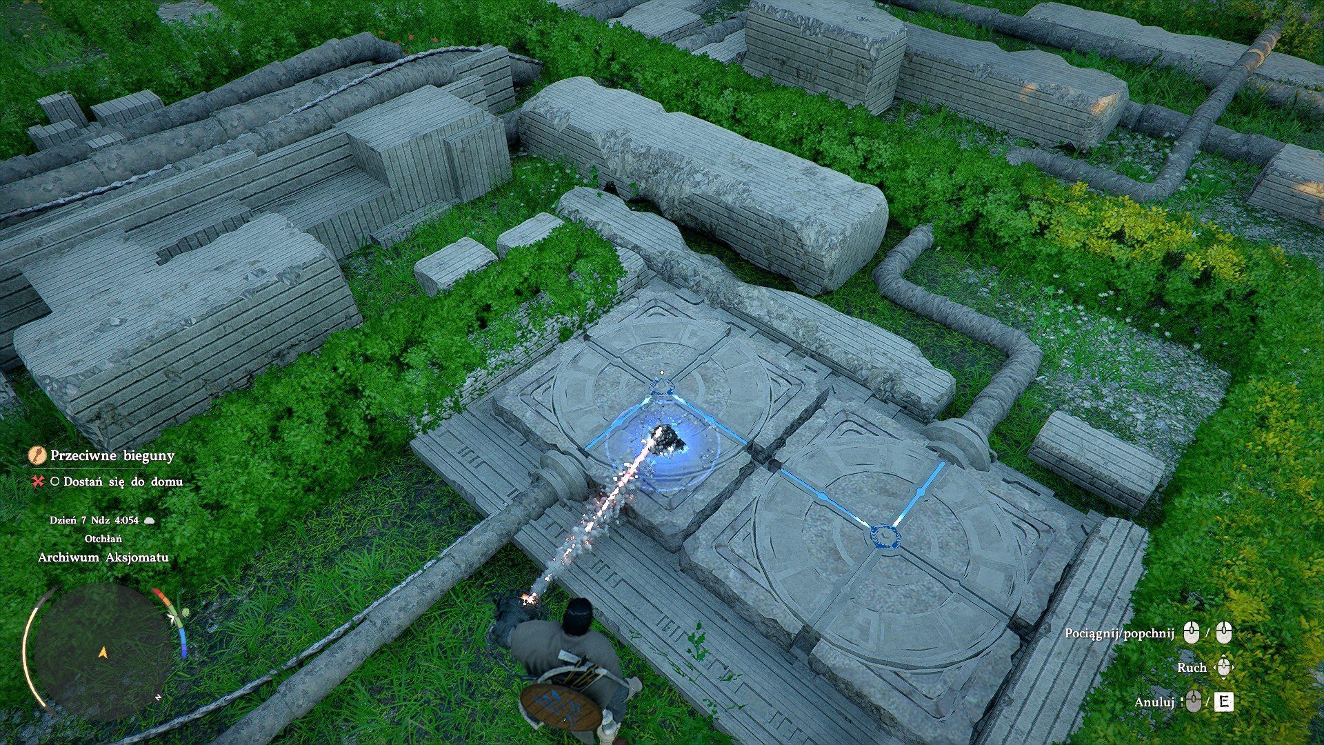 - Po podejściu do budynku pozyskacie Moc Aksjomatu - od razu trzeba jej użyć do rozwiązania zagadki otwarcia archiwum. Zdobyta moc pozwala na chwytanie obiektów i poruszanie nimi. Aktywuje się ją wciskając TAB na klawiaturze (do manipulowania posłuży dodatkowo mysz) lub wciskając lewą gałkę analogową (L3) na padzie.