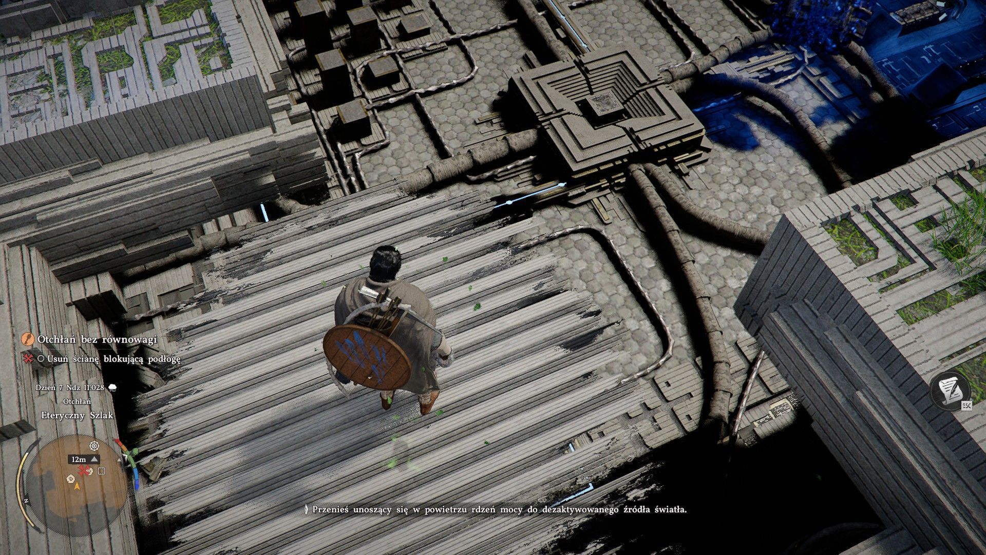 - Musicie teraz manipulować Mocą Aksjomatu żeby doprowadzić rdzeń do nieaktywnego źródła światła zaznaczonego na obrazku. Udaną akcję potwierdzi fakt zaświecenia się rdzenia na niebiesko. Możecie już zeskoczyć na dół i zająć się opisaną poniżej drugą zagadką.