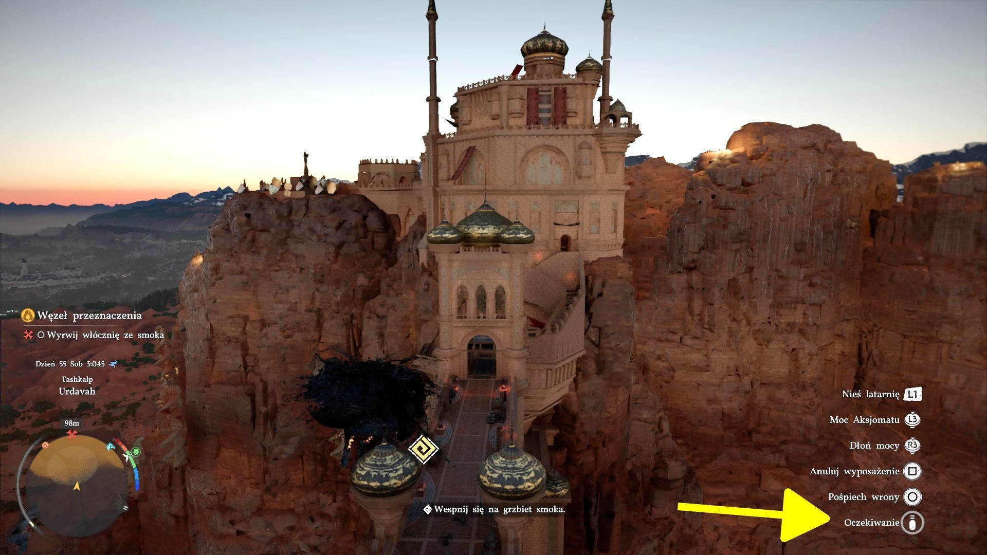 - Wyruszcie w stronę Wielkiej Bramy Urdavah (możecie tam poszybować). W bocznym menu pojawi się opcja Oczekiwanie - zaznaczyliśmy ją na obrazku. Jej wybranie pozwoli automatycznie przenieść Kliffa w optymalne miejsce do rozpoczęcia zadania wskoczenia na smoka.