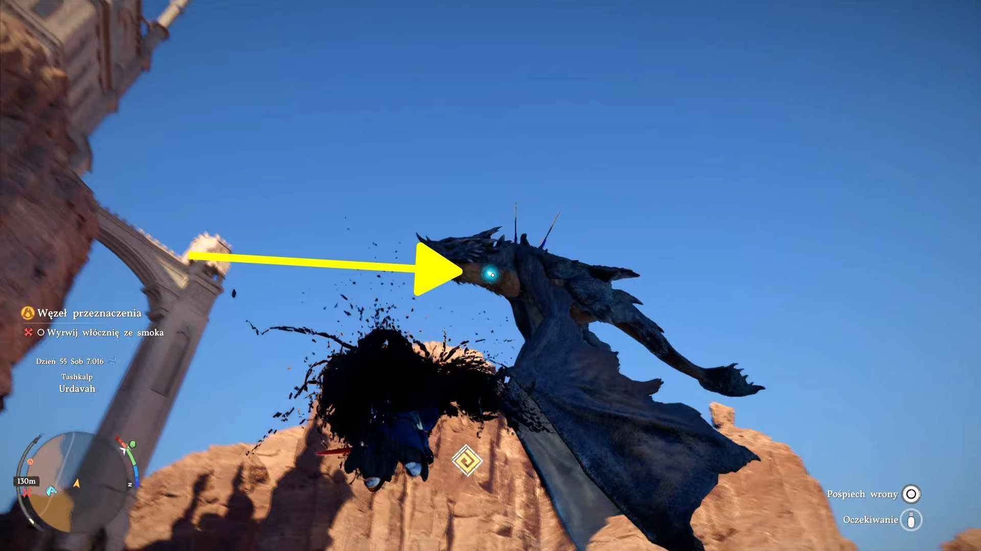 - Po spotkaniu ze smokiem rozpocznie się nowy główny quest Węzeł przeznaczenia. Smok zacznie latać w pobliżu Urdavah. Zadaniem Kliffa będzie wylądowanie na smoku i wyjęcie włóczni wbitej w ciało latającej bestii.