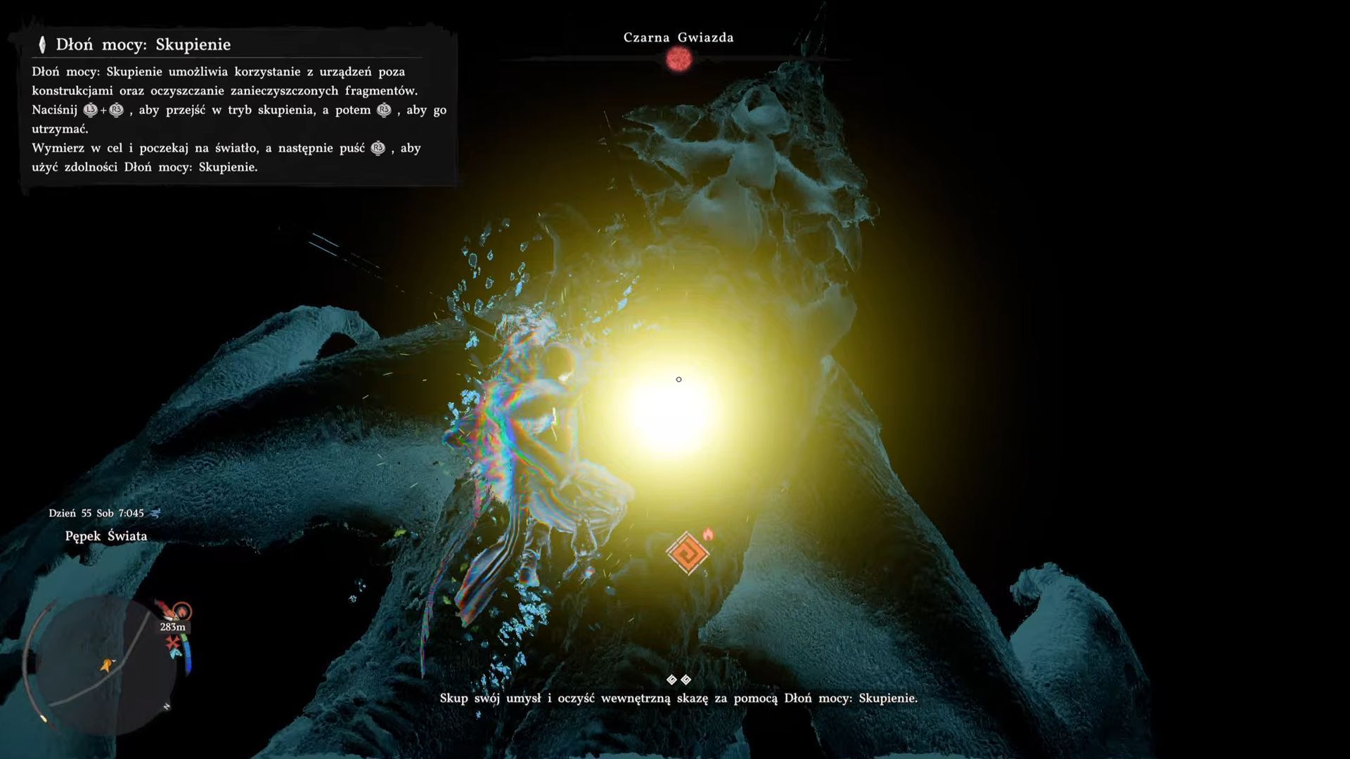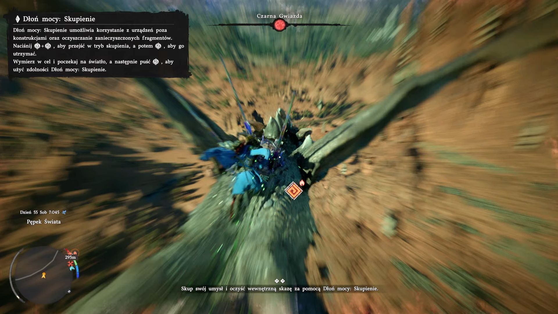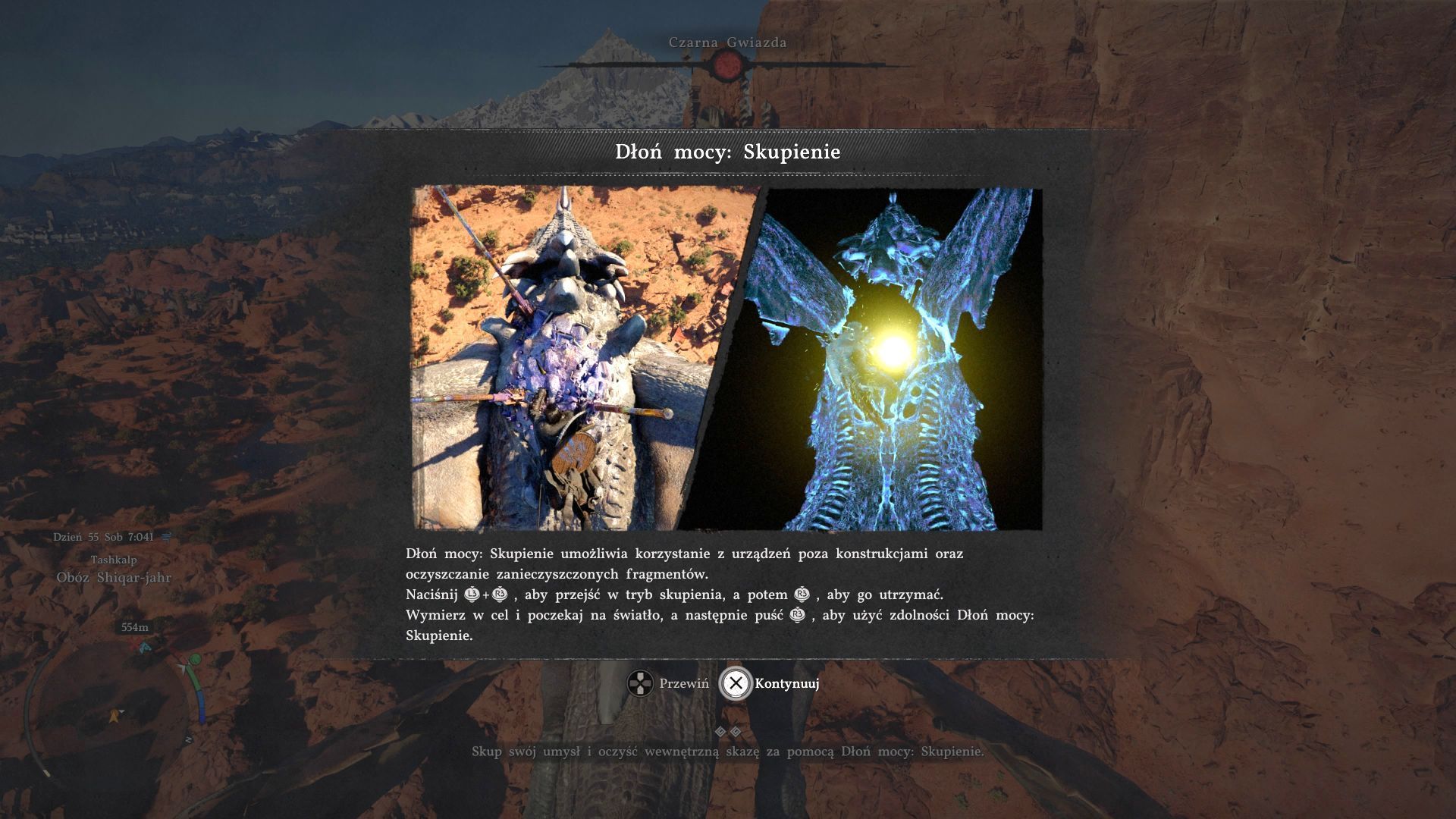- Trzymajcie się smoka do momentu pokazanie na screenie ekranu z opisem mocy (powyższy obrazek). Do wyrwania włóczni posłuży konkretnie Dłoń mocy: Skupienie.