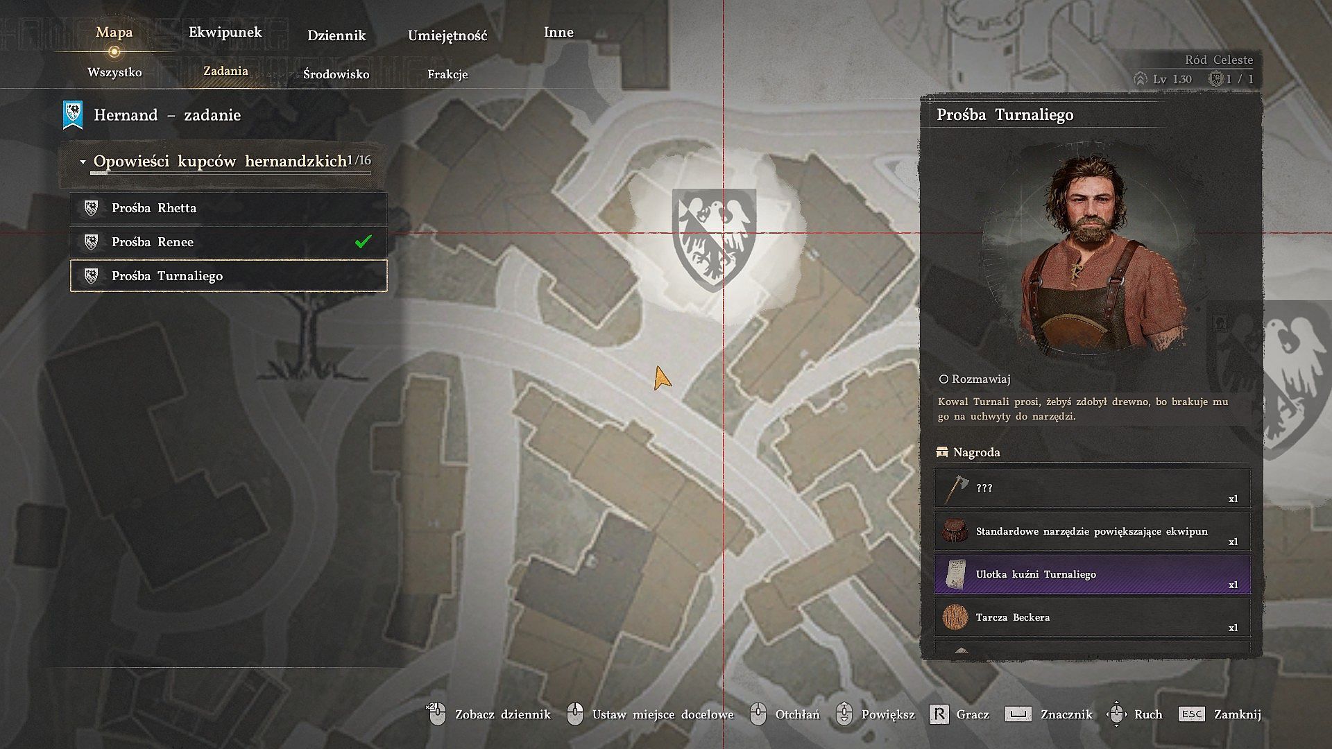 - Spotkanie się z kowalem pozwoli Wam ustalić, że Turnali potrzebuje 3 sztuk drewna wysokiej jakości będącego jedną z odmian materiałów do craftingu. Od kowala możecie też za darmo otrzymać siekierę drwalską, która posłuży Wam m.in. do wykonania tego zlecenia.