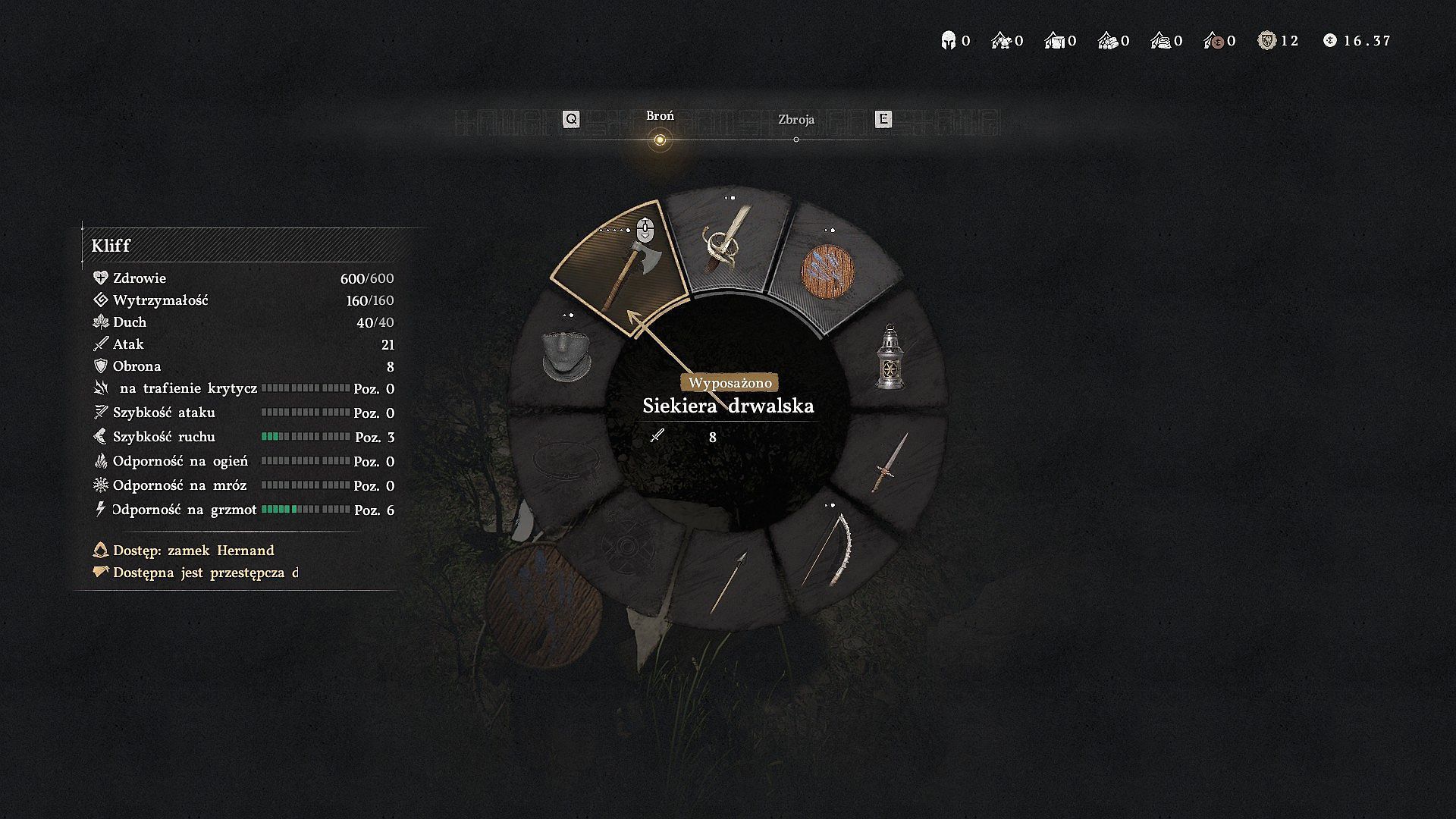 - Musicie wyposażyć Waszą postać w siekierę drwalską - możecie wybrać ją w oknie wyposażenia lub z listy narzędzi w rozwijanym menu broni (powyższy obrazek).