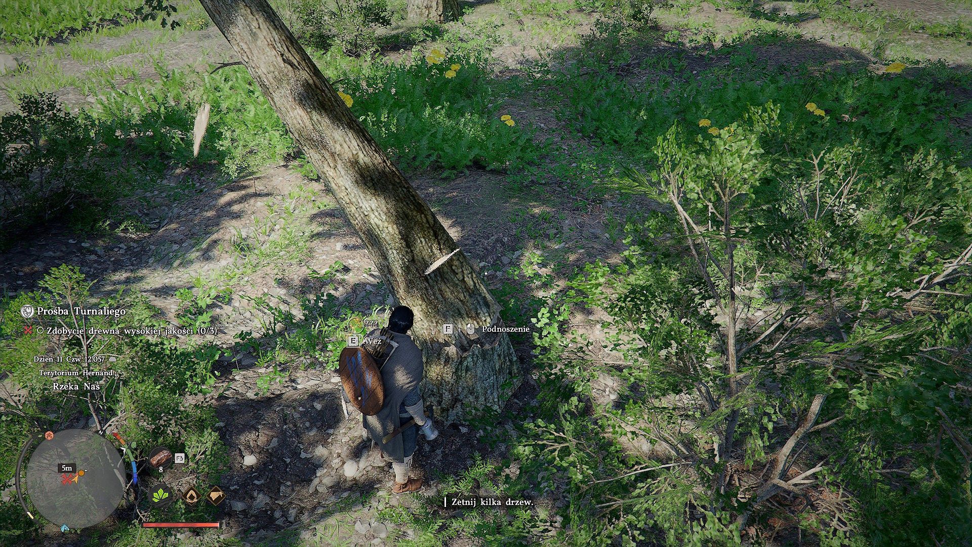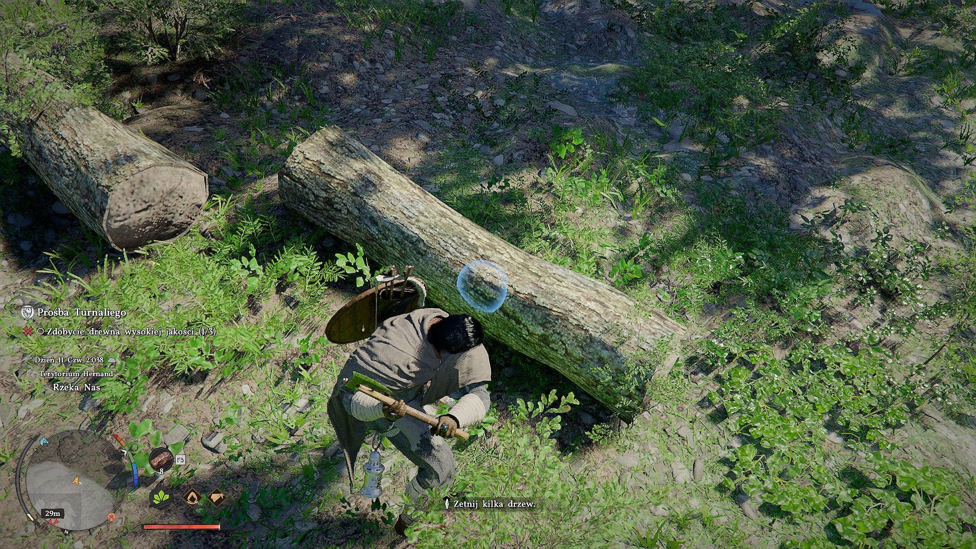 - Po wyjęciu siekiery podejdźcie do jednego z drzew w zaznaczonym obszarze na mini-mapie i przytrzymajcie klawisz celowania (CTRL na klawiaturze, L1/LB na padzie).