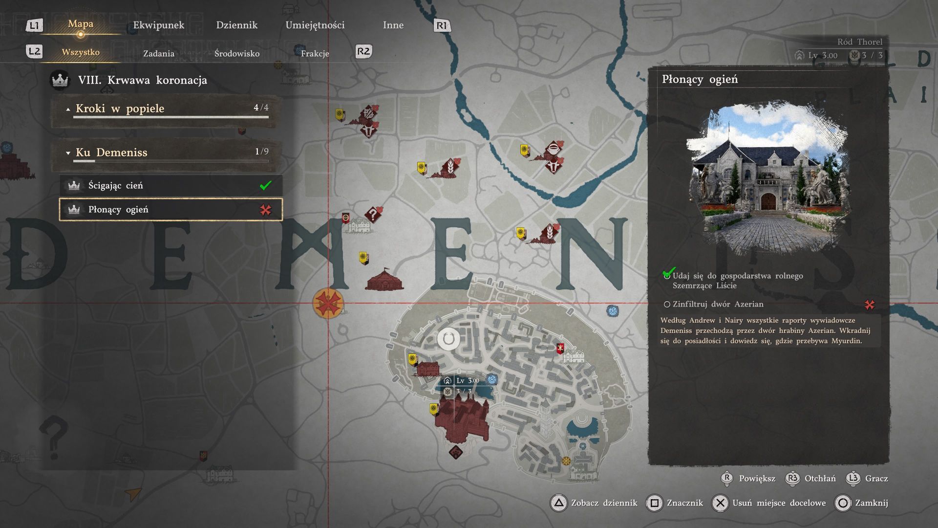 - Dwór Azerian znajduje się na zachód od miasta Demeniss i musicie do niego dotrzeć w dalszej części głównego questu Płonący ogień. Główne drogi w tej części mapy patrolują wrogie oddziały. Jeśli nie chcecie z nimi walczyć, to bezpieczniej jest podróżować polami.