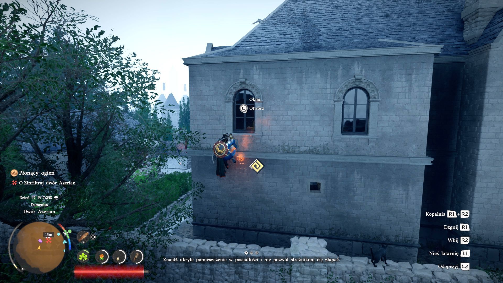 - Najlepsza metoda na zinfiltrowanie głównego budynku to dotarcie do jednej z okiennic na piętrze. Wdrapcie się po ścianie, otwórzcie okiennicę i wejdźcie przez nią do środka.