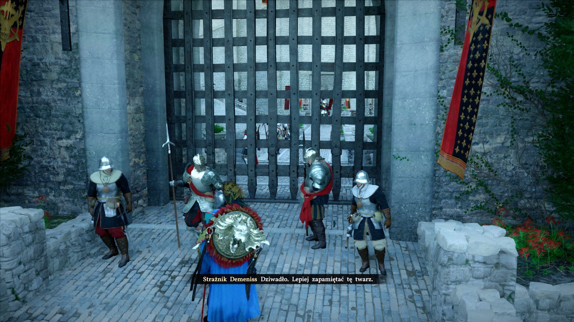 - Przy próbie skorzystania z głównego wejścia do zamku zatrzymają Was strażnicy i niestety nie przewidziano tu opcji wyposażenia się w strój, który pozwoliłby na wpuszczenie bohatera do środka. Dotyczy to nawet tych elementów ubioru, które mają w opisie informację o przebraniu Demeniss - strażnicy przez to przejrzą i brama do zamku pozostanie zamknięta.