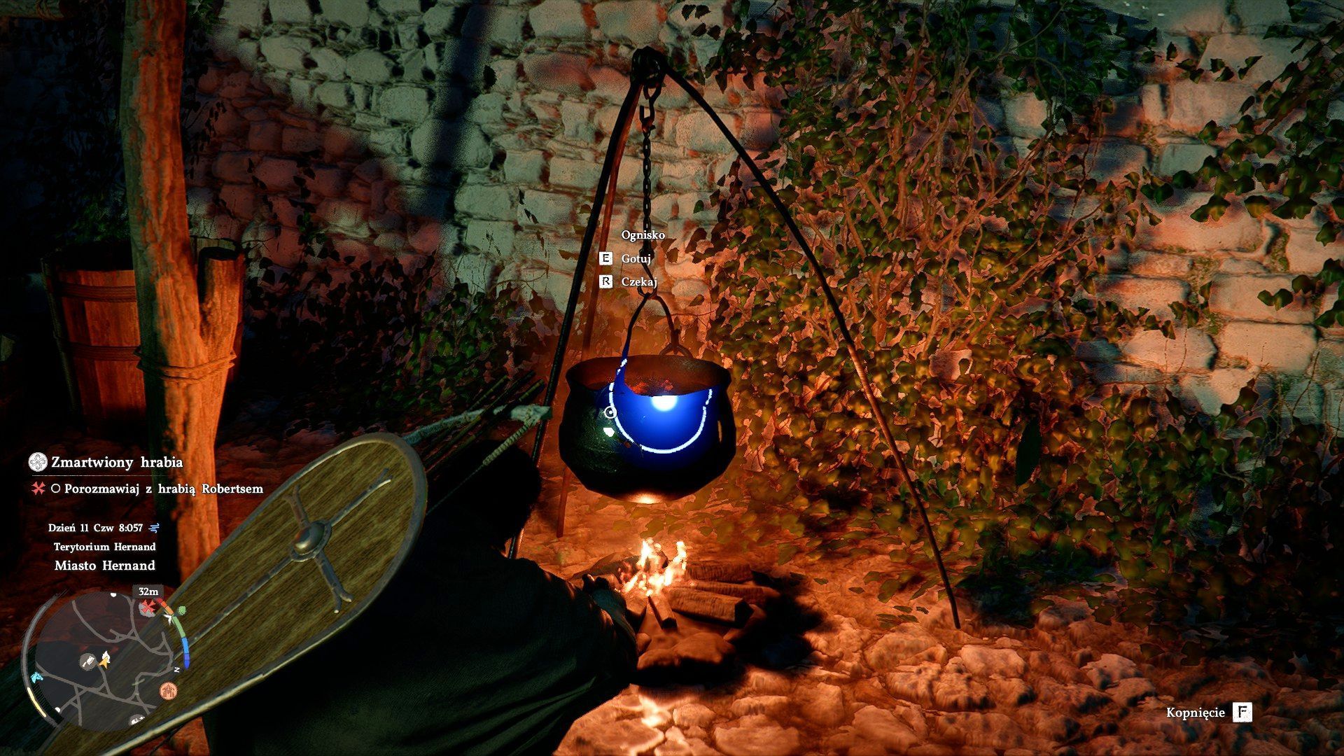 - Przyśpieszenie upływu czasu jest możliwe na 2 główne sposoby. Pierwszy wariant to zaczekanie przy ognisku. Ogniska to lokacje z kotłami, które są też używane do gotowania (możecie je znaleźć na przykład w wiosce Hernand). Pojawiają się one też w wielu odwiedzanych obozach.