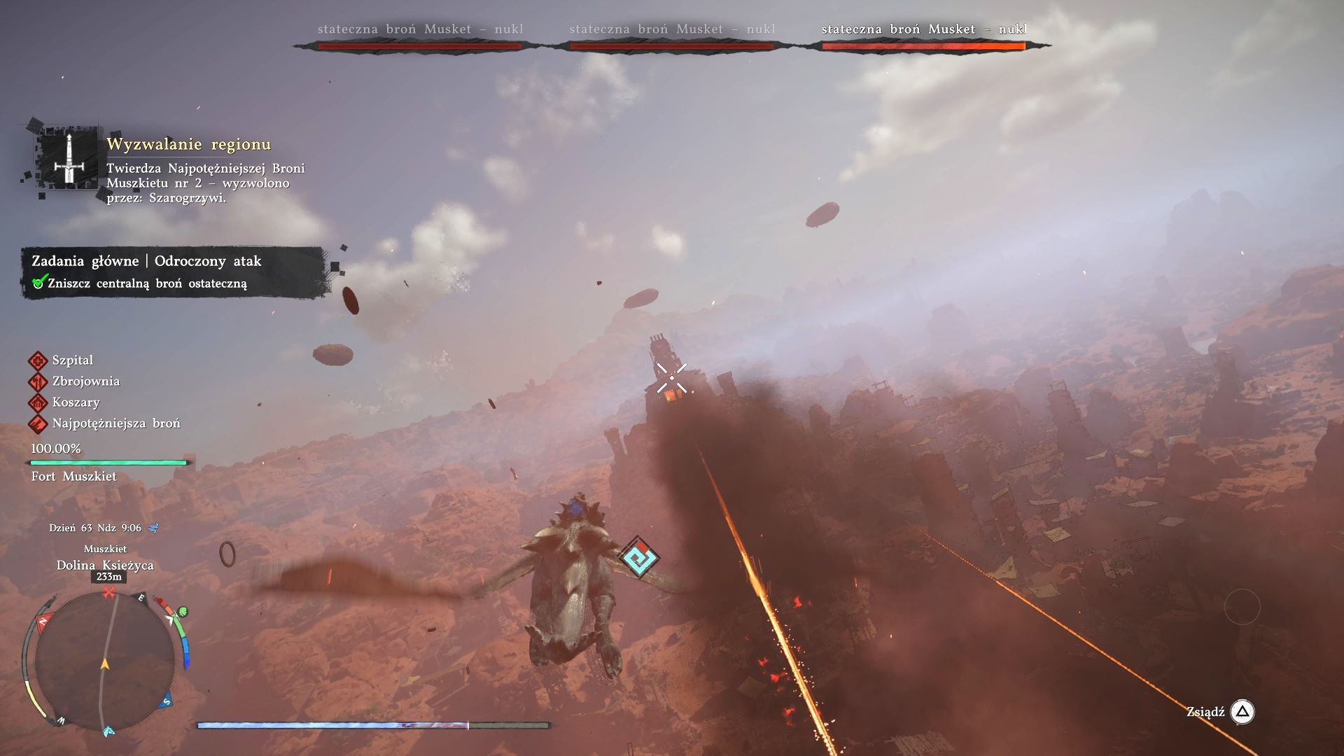 - Do uszkadzania broni ostatecznych wymagany będzie smok, którego odblokowaliście przed atakiem na Latającą fortecę Orbian. Możecie przywołać smoka po przytrzymaniu F1 na klawiaturze lub górnego kierunku na padzie. Latanie na smoku dokładniej opisaliśmy też na stronie FAQ Jak odblokować smoka Czarna Gwiazda?.