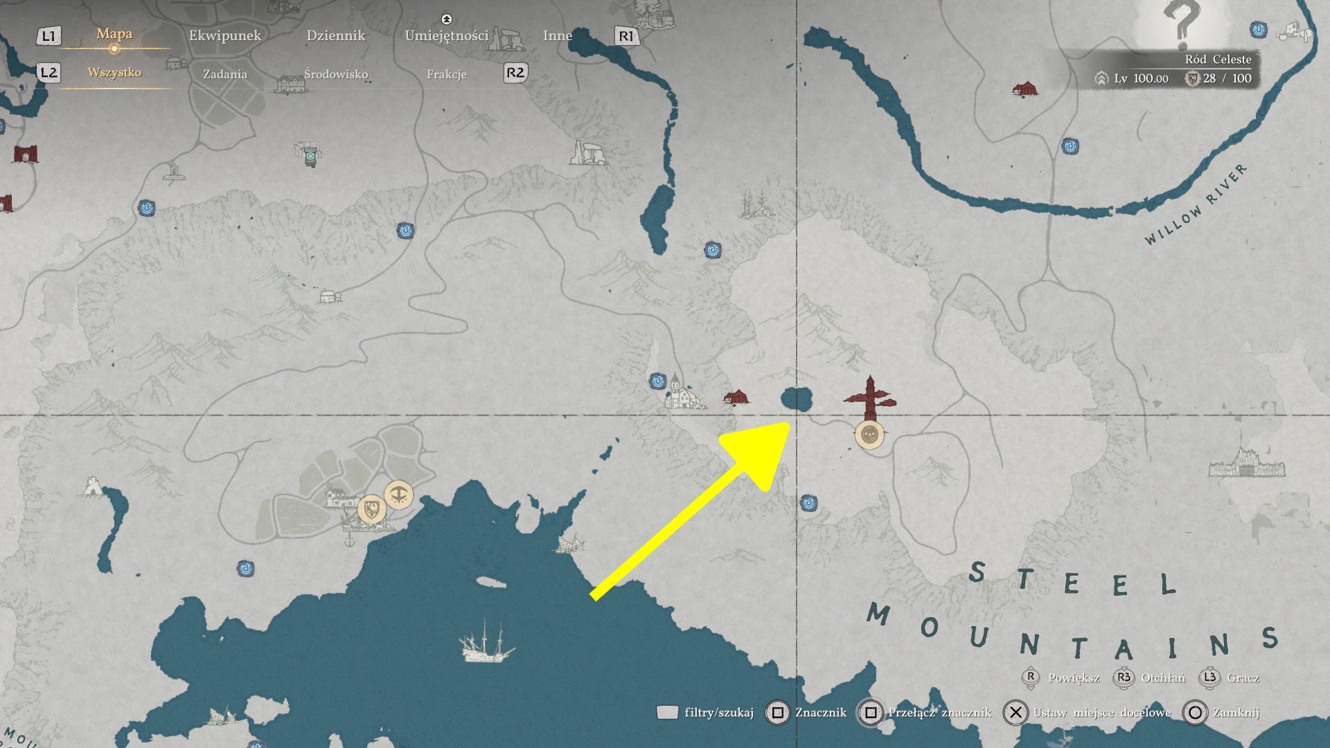 - Odnalezieniem tego konia możecie zająć się w południowej części regionu Hernand. Jest to obszar Stalowe Góry (podpis Steel Mountains na mapie). Dotrzyjcie do małego jeziora na zachód od Iglicy Mądrości.