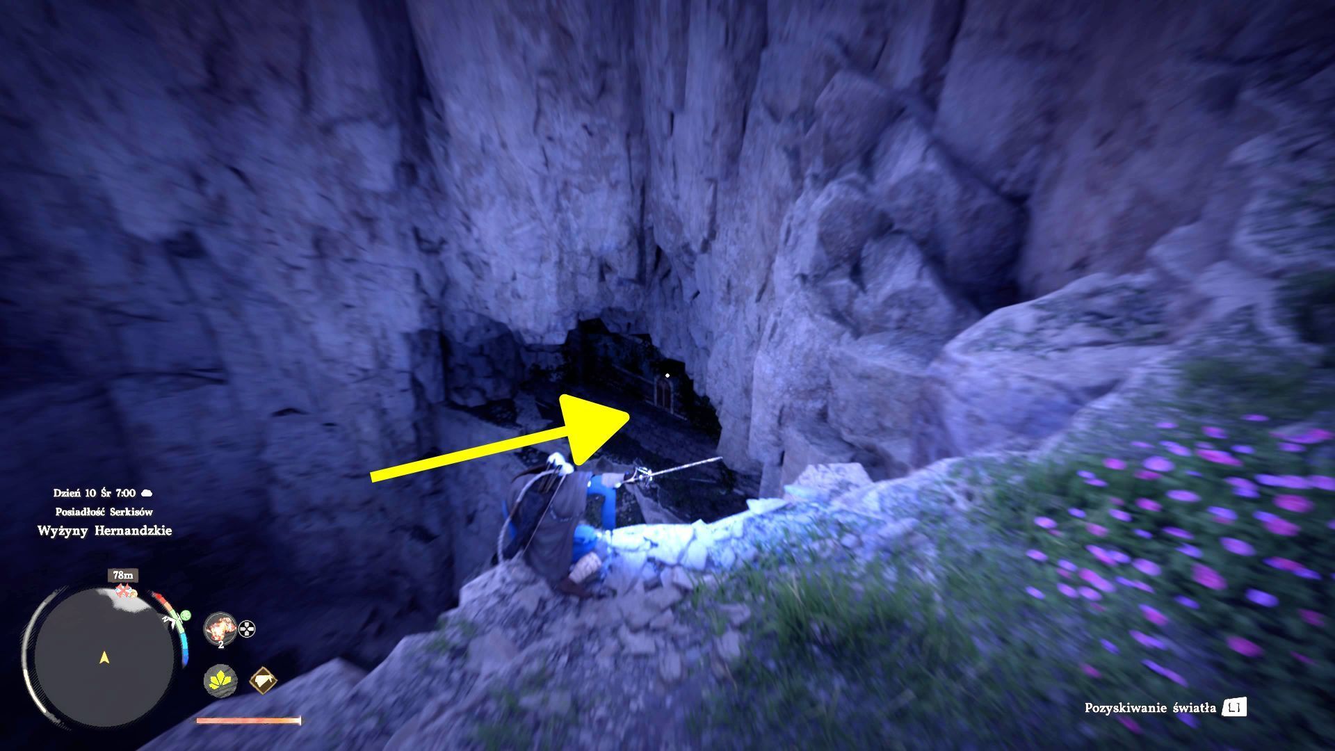 - Na południowy-wschód od obozu drużyny Wyjące Wzgórze znajdują się Łąka Myśliciela oraz sekretna lokacja Tajemnicza energia. Po dotarciu w to miejsce możecie pomóc sobie odbiciem światła do zlokalizowania ruin. Jest to dolny otwór na ścianie klifu pokazanej na powyższym obrazku i możecie tam poszybować dzięki opcji lotu (lub zaliczyć wspinaczkę jeśli wylądowaliście niżej).
